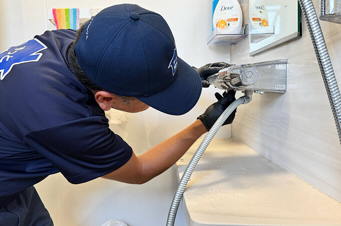 水まわりについては、毎年一度、プロがクリーニングと点検を行います。一番面倒なレンジフードの分解洗浄、手が届かない浴室の天井、便座を取り外しての裏側洗浄、宅内排水管の洗浄——これらすべてを、お付き合いが続く限り毎年無料で行います。点検では、水栓やパッキンの状態、排水の流れなどを確認し、不具合につながりそうな傾向があればその場で対処します。水まわりの不具合は汚れの蓄積が原因になることがほとんどです。毎年クリーニングすることで、そもそも不具合が起きにくい状態を維持します。