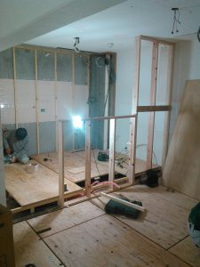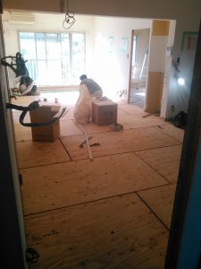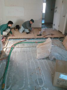 弊社大工の小野塚親子がマンションの床全体を解体し、新しい床下地組を行なっています。
