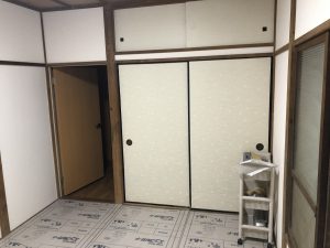 今回は畳を撤去し、フローリングでの仕上がりになりますが、別の工事が入るのでそれまで養生されています。