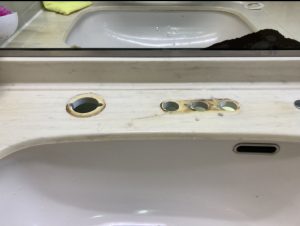 既存の水栓は20年以上お使いとの事で洗面台に穴が4カ所あいていました。
