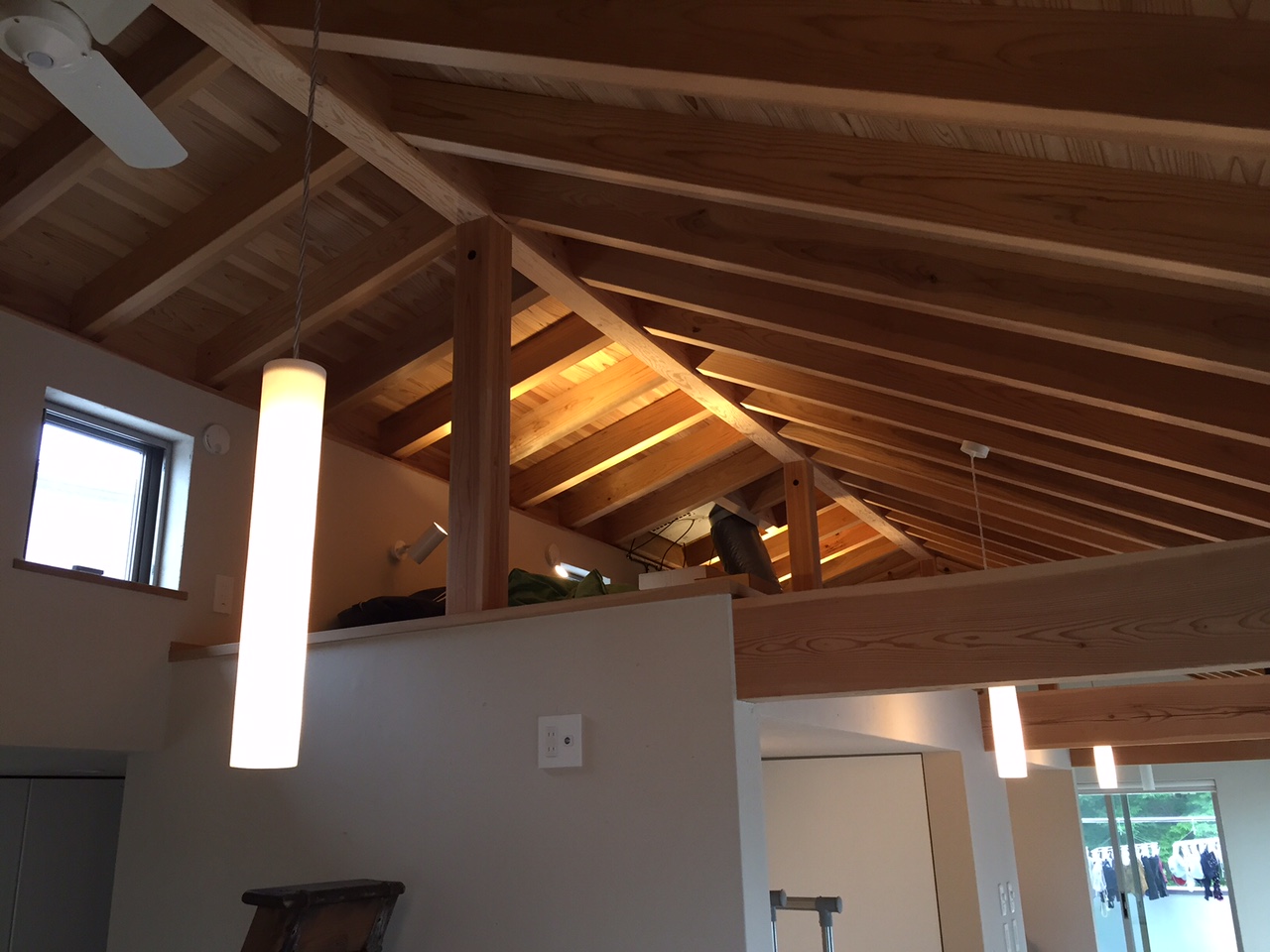 一般的には平天井が多いですが、こうやって勾配天井にして屋根の形を表してみると見応えが出ます。