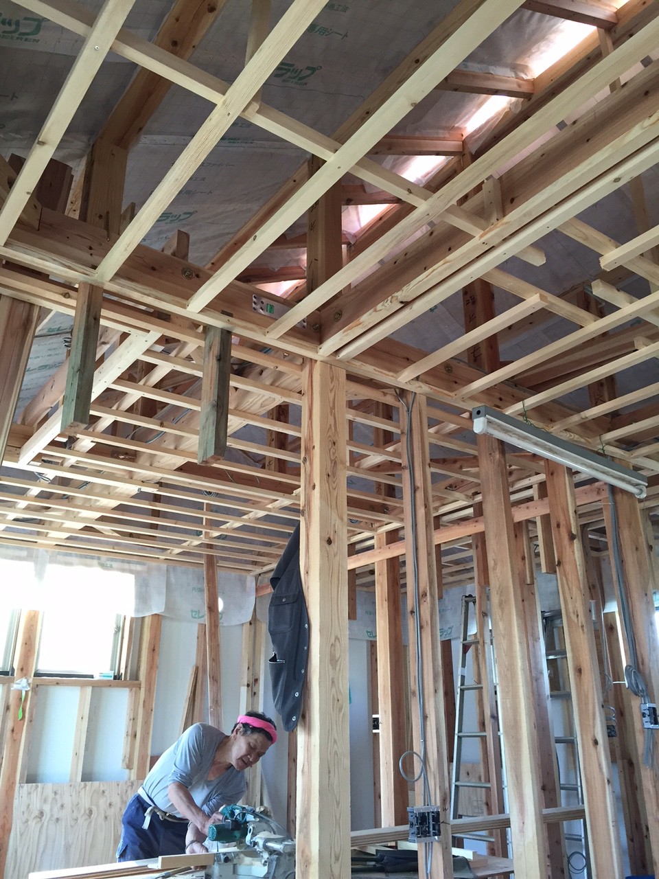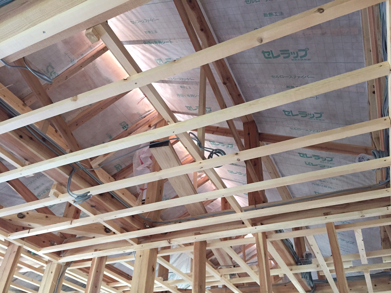 手前側に規則的に並べられている木組みは、天井下地になりますので、石膏ボードが張られていき天井になっていきます。
