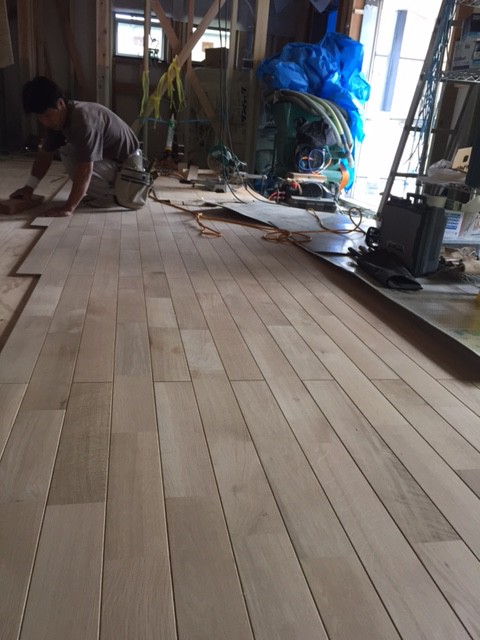 佐倉市にて建築中の新築住宅の現場では、無垢フローリング張りが始まりました。