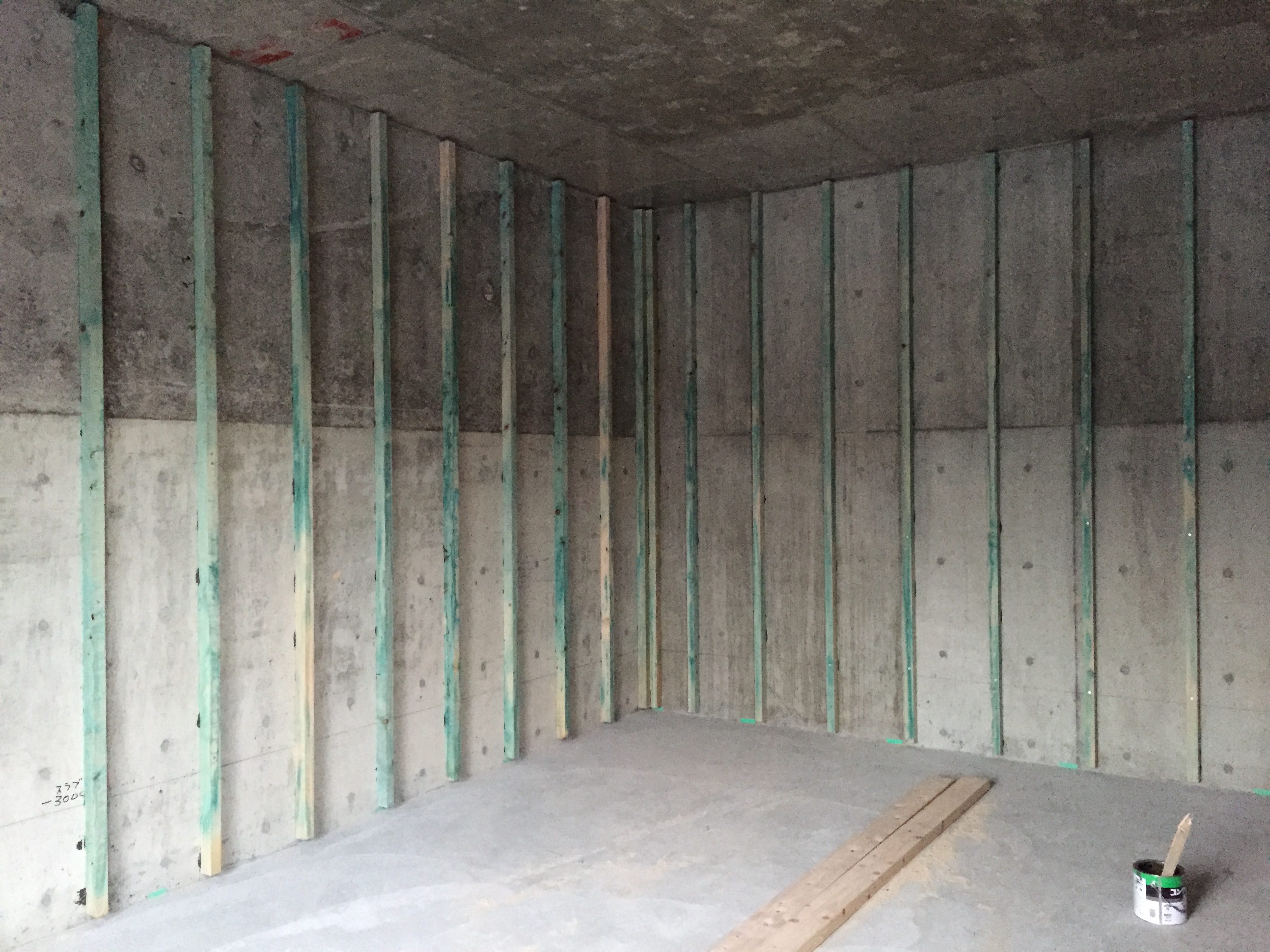 この段階で地下室内部の壁と床には、防水・止水、ひび割れ自己修復機能、中性化抑制、塩害抑制、アルカリ骨材反応抑制効果のあるコンクリート改質剤を塗り終えています。