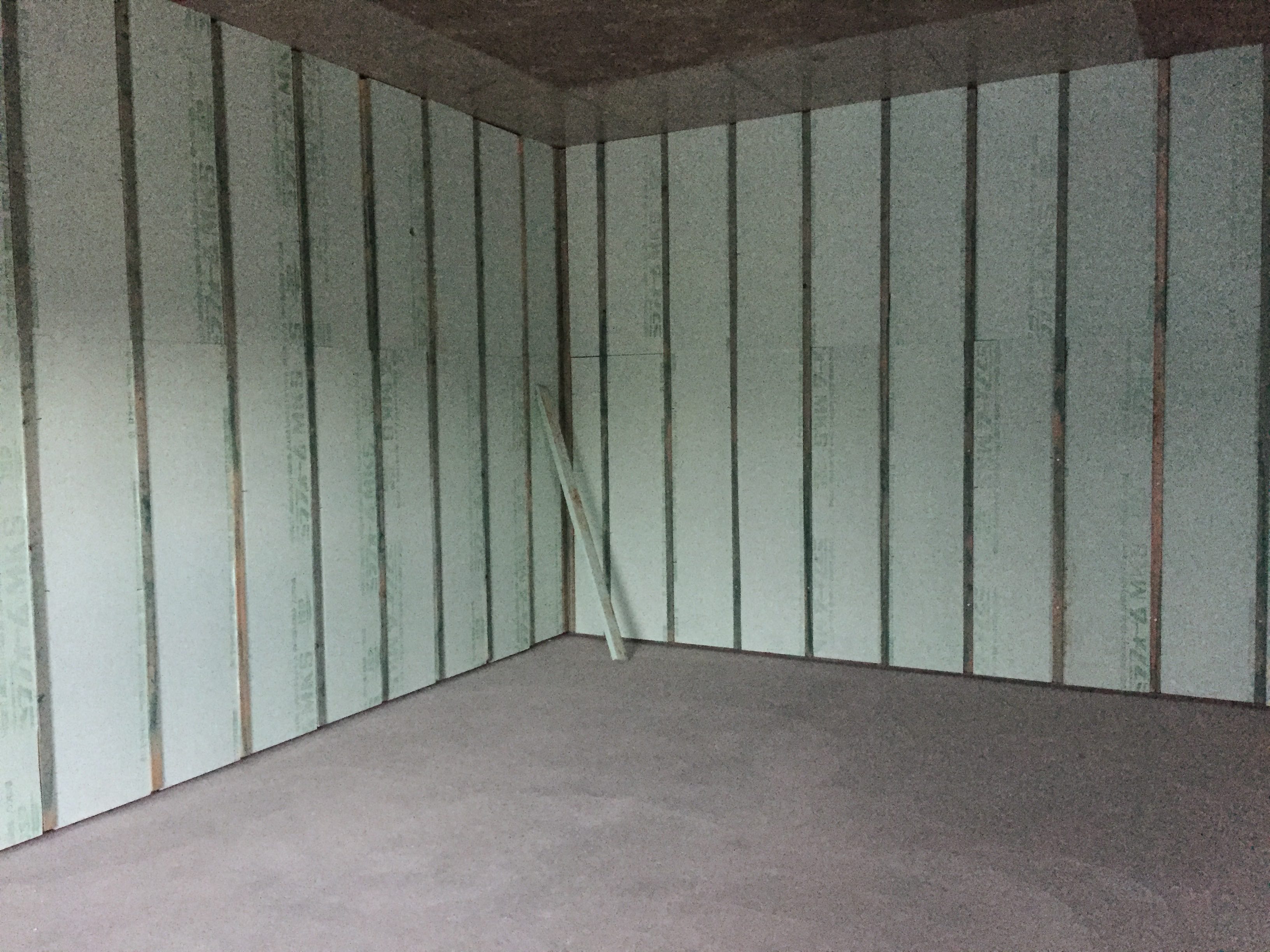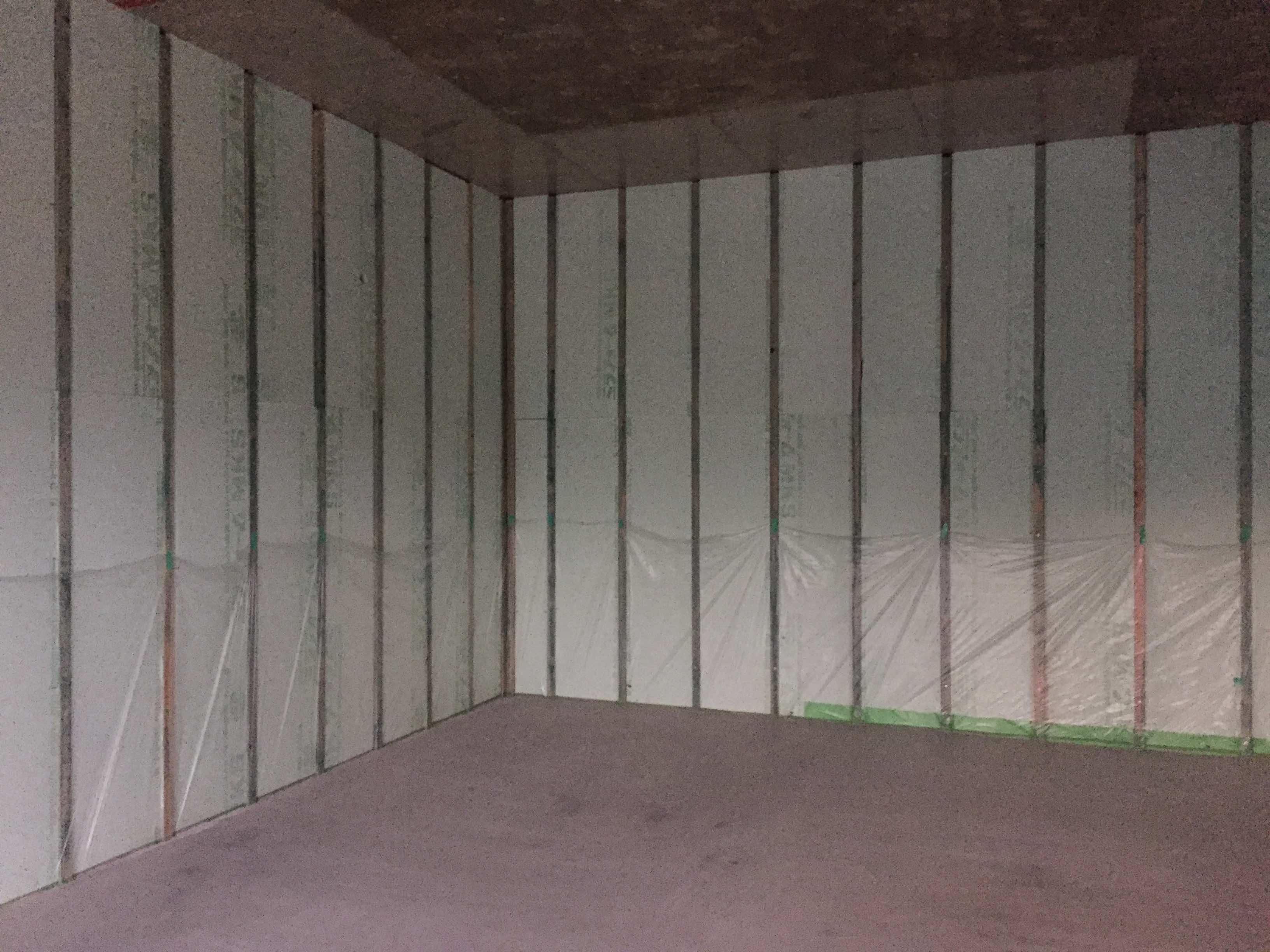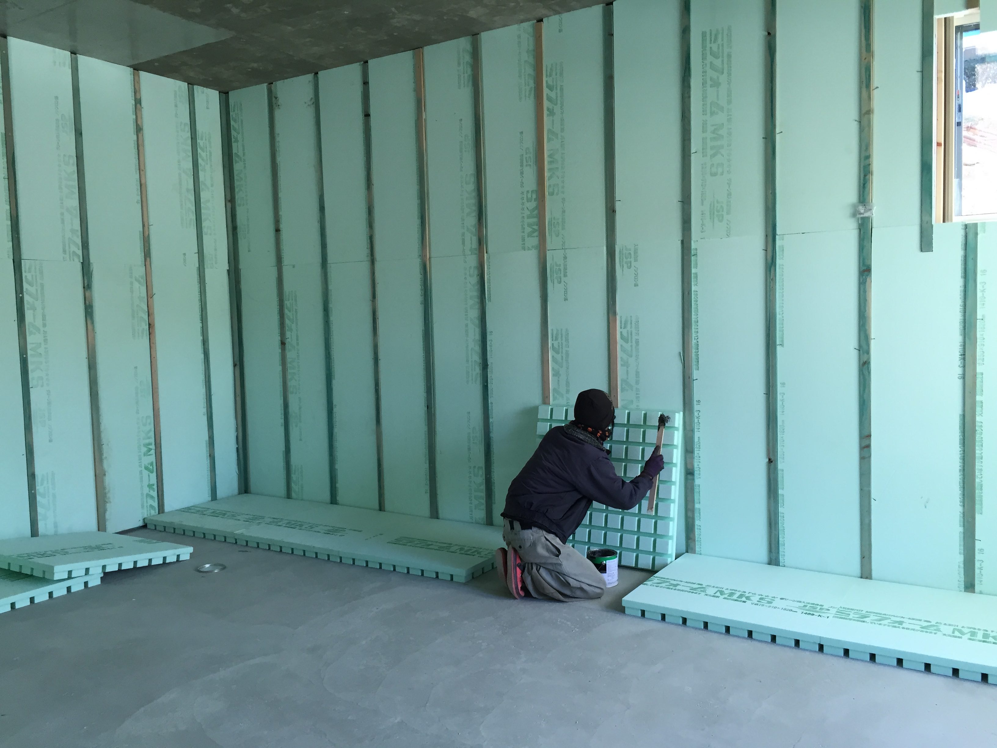 ▲床にも壁と同じく地下の湧き水処理・結露防止の断熱パネルを張りました。