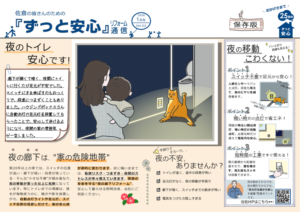 そのため、今月号ではポイントとして、人感センサー付きの足元灯をご紹介しました。これだけで、夜の安心感が劇的に変わります。