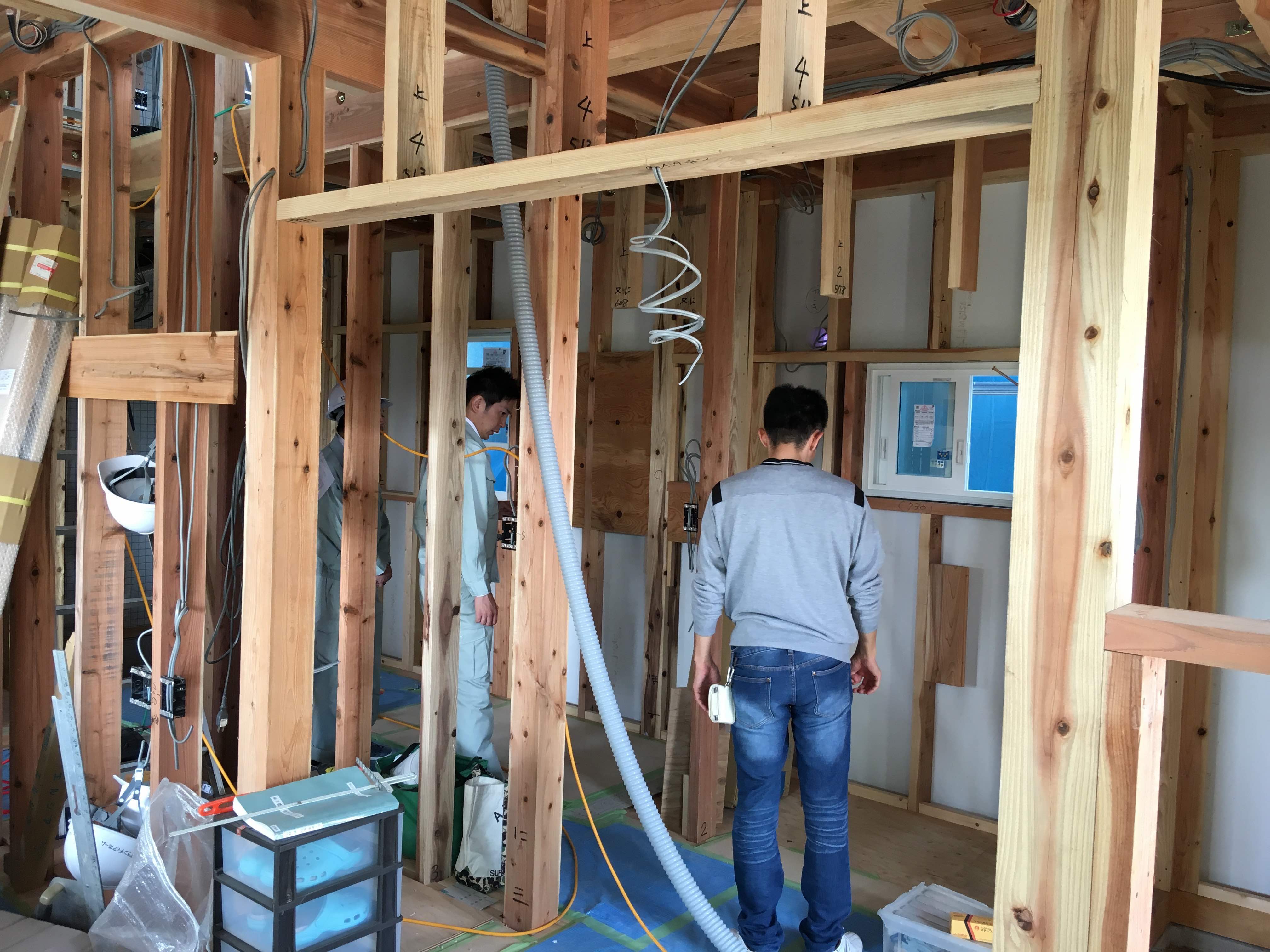 この日は、大工工事だけでなく、外壁漆喰の下地となるラス網張りや断熱材のセルロースファイバーの吹き込みもそれぞれの職人が工事しています。