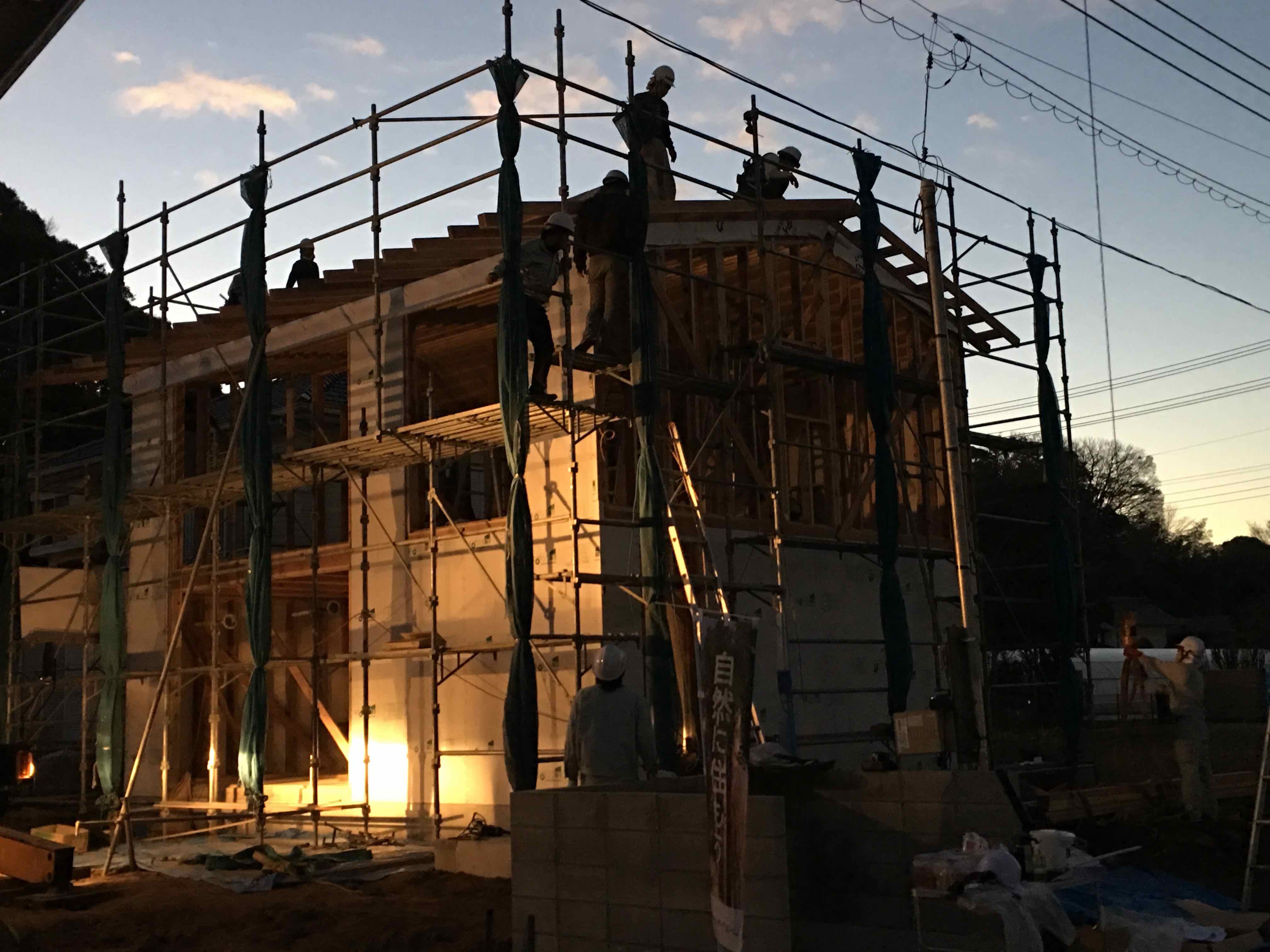 ▲さすがに、日没が早いので耐力面材のモイスをすべて張り終えることはできませんでした・・・・