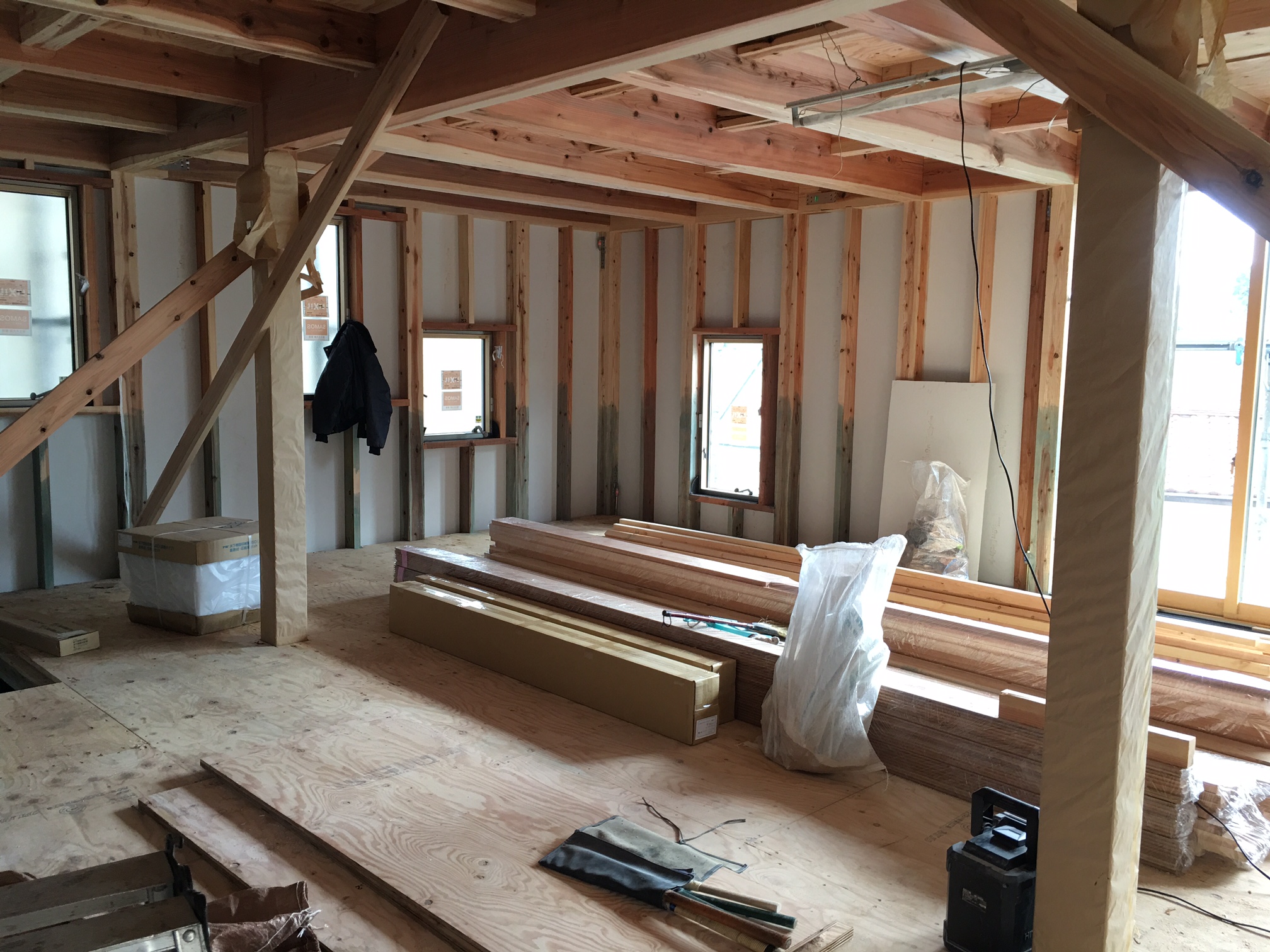 わが家にも当然、このモイスを張っています。構造材もこちらの現場と同じ千葉県産の天然乾燥させた杉と桧です。