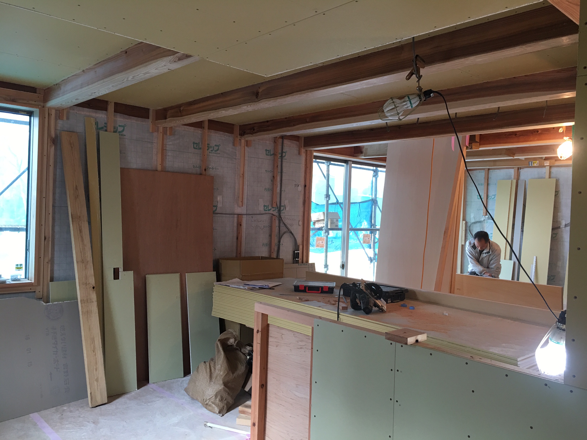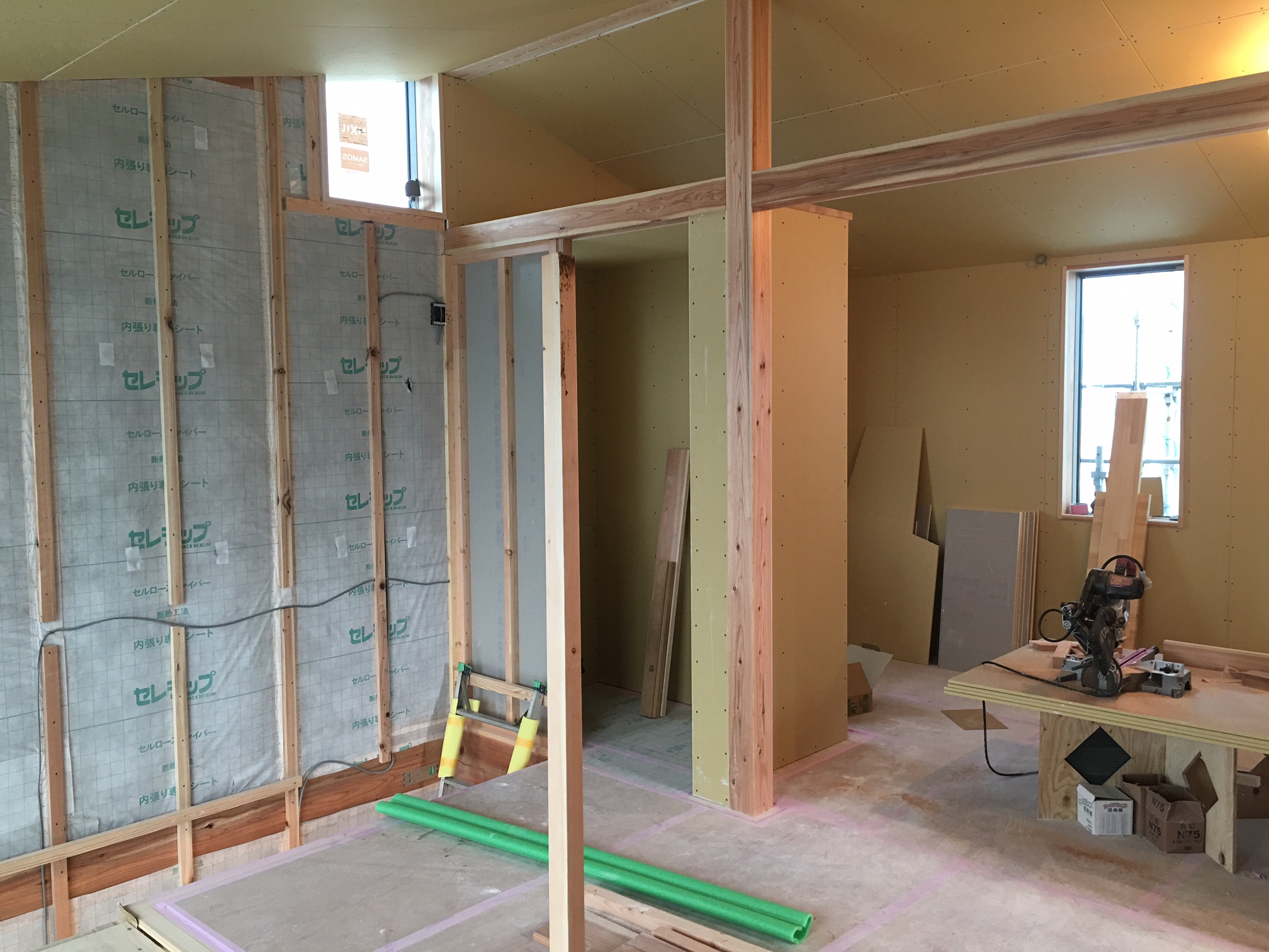 工事中でも、セルロースファイバーの高い断熱力のおかげで現場の中は暖かいです。
