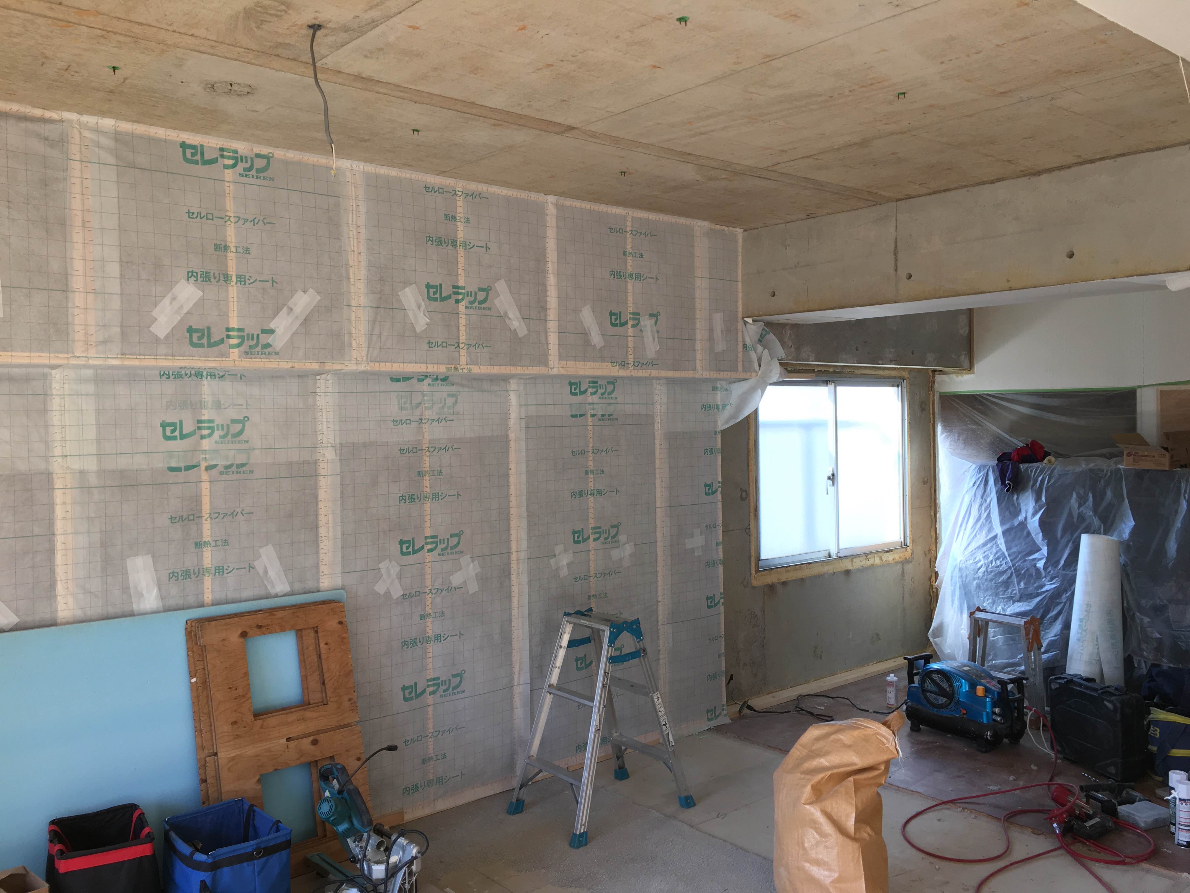 窓が見える部分にも、これからセルロースファイバーを吹き込みますが、マンションの躯体であるコンクリートが見えています。