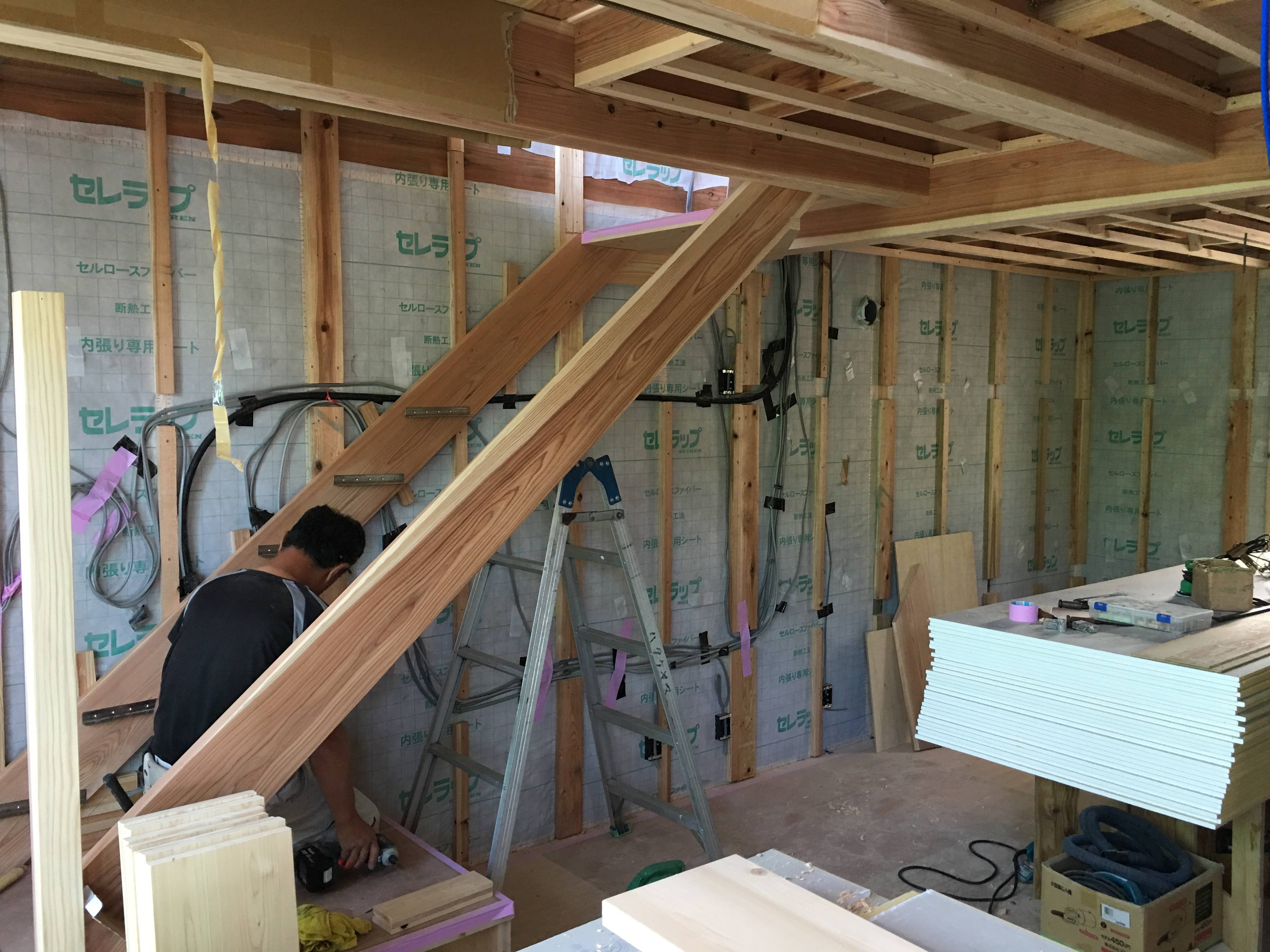 斜めに見えるのは、階段の“ささら桁”で杉になります。