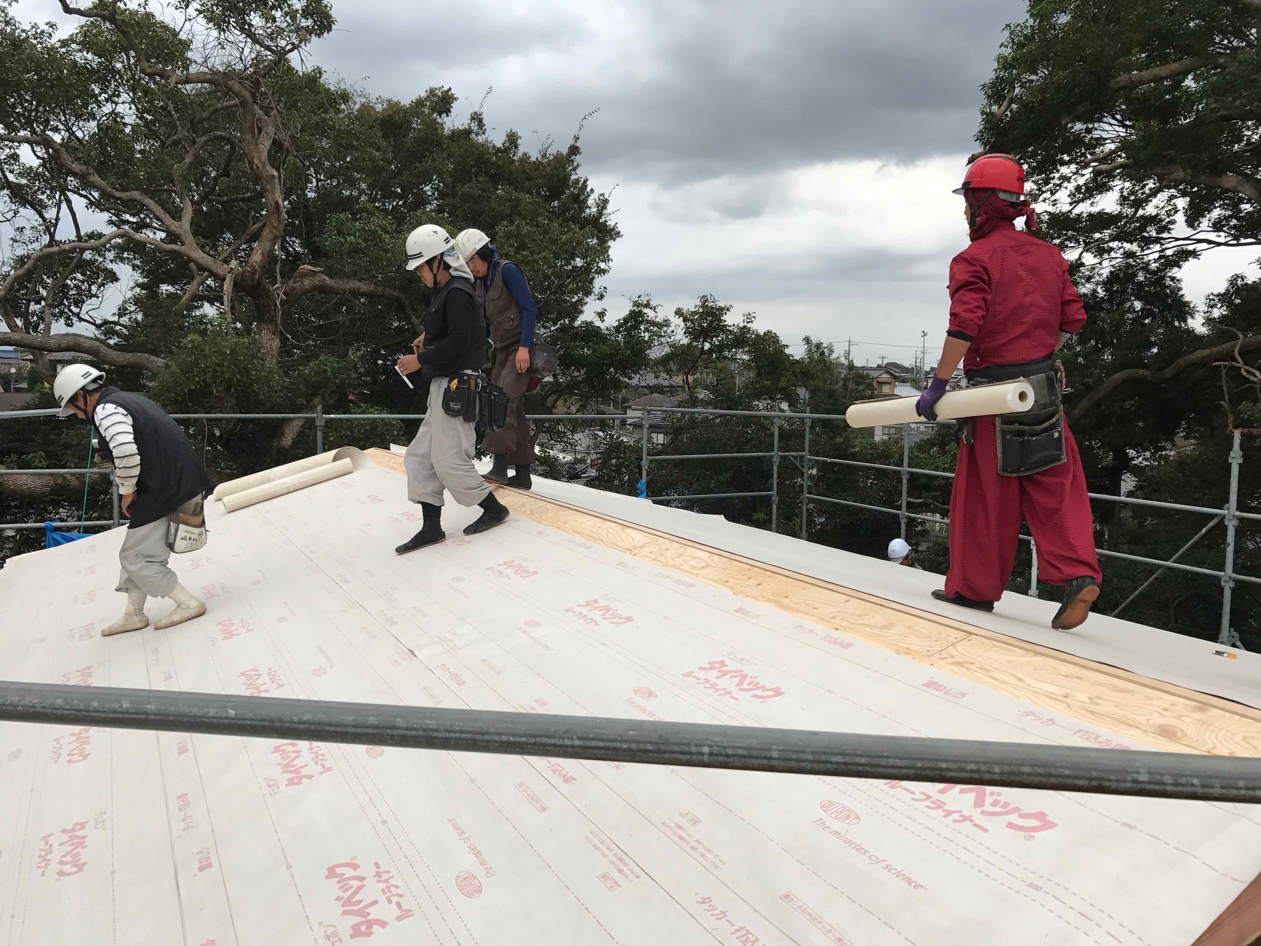 夕方、屋根のルーフィン材を張っている様子です。