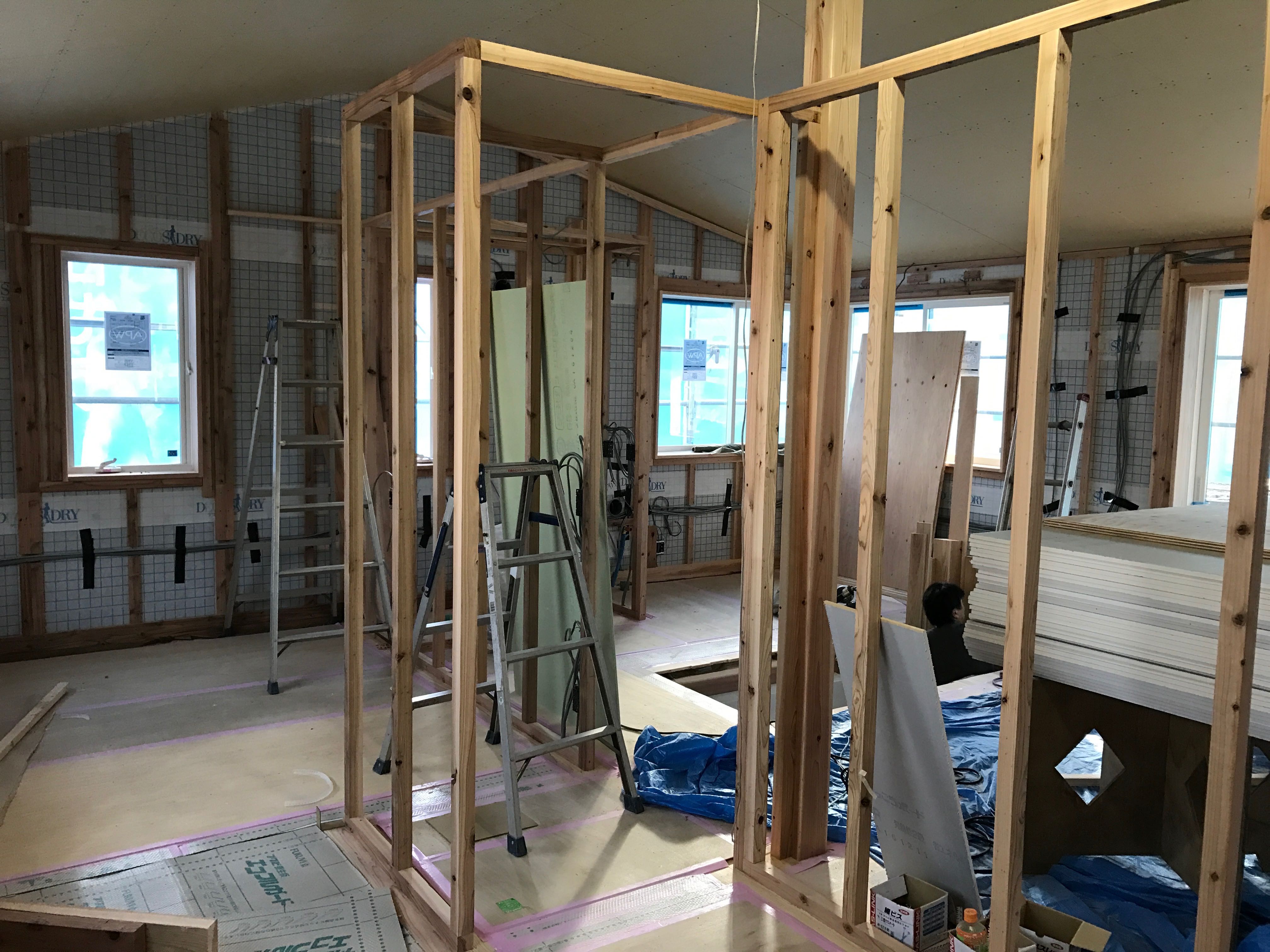 すでに、この現場は床の杉の無垢フローリングが張り終わってるので、きっちり養生がされています。
