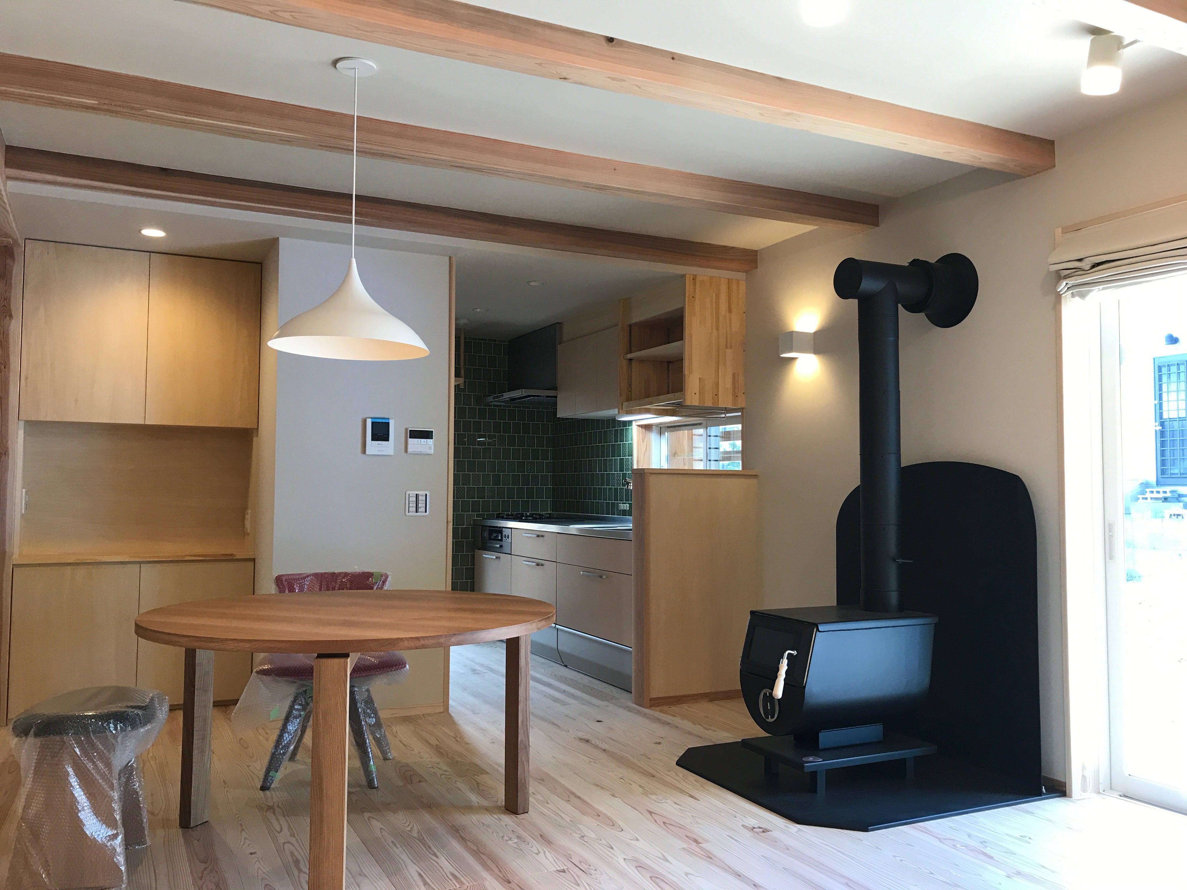 薪ストーブは国産、スツールと椅子も国産。