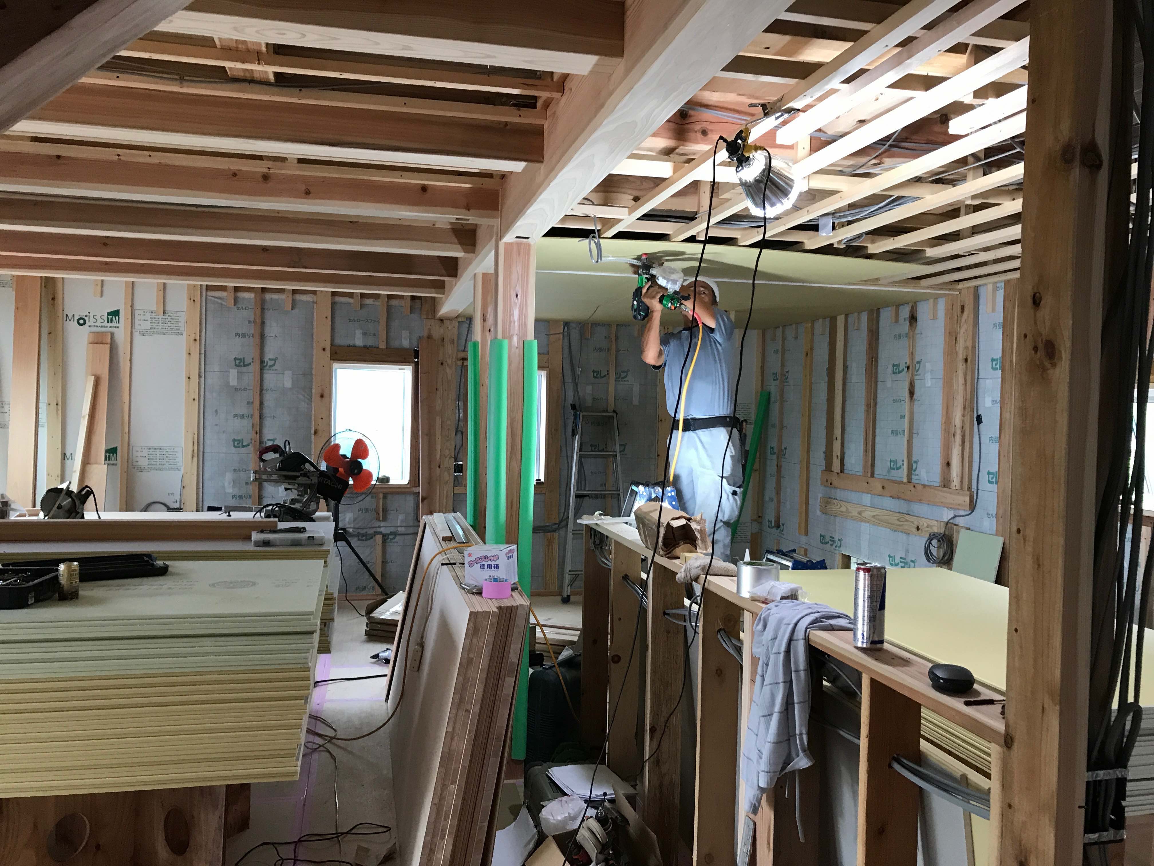 大工による下地工事がほぼ終わり、石膏ボード張りを行なっています。