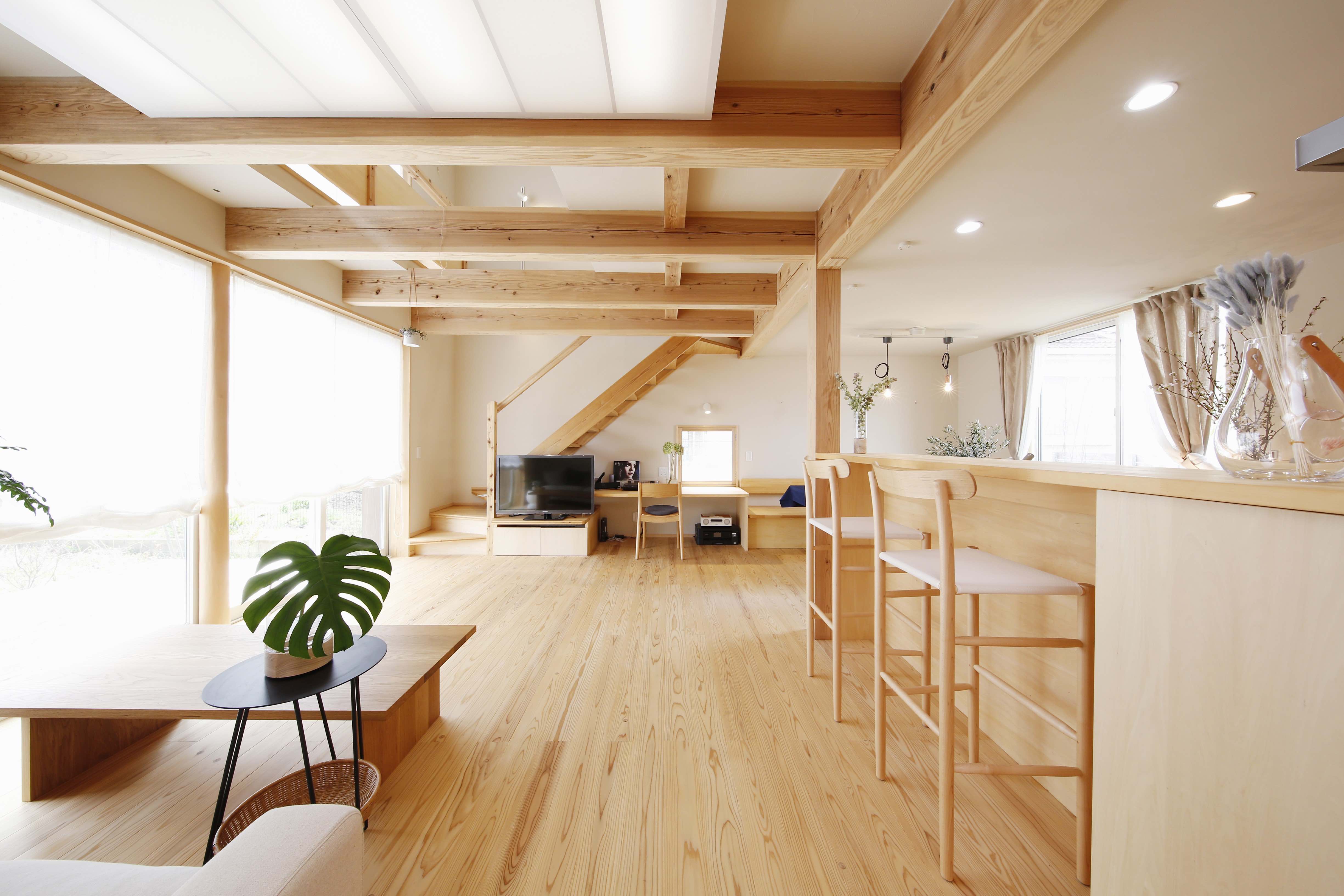 柱や天井に見える梁は、地元千葉県産の無垢の杉です。
