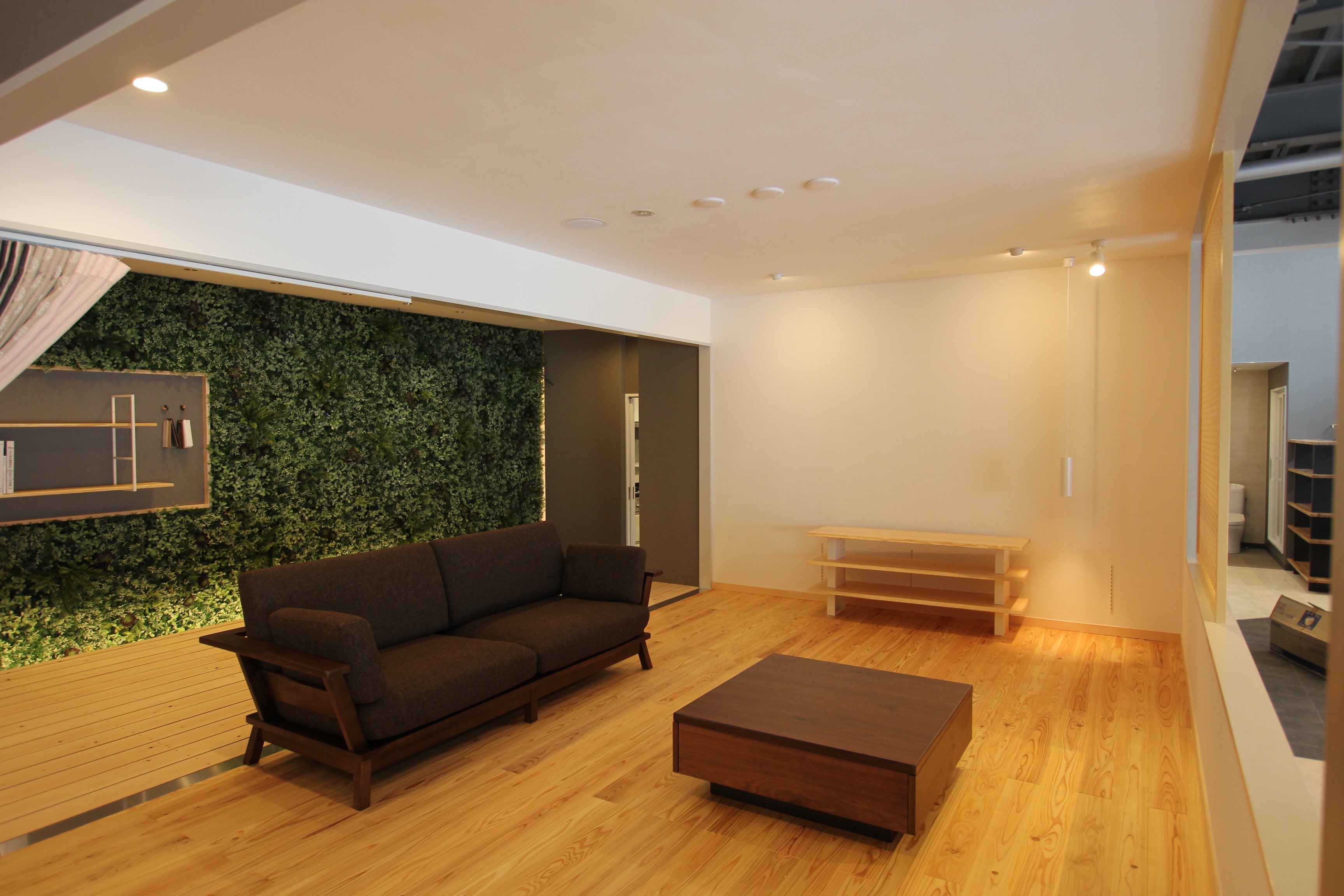 ▲新ショールームには、新築住宅『びおハウス』のリビングとウッドデッキの空間もあります。