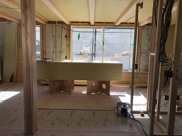 無垢の杉フローリングが張り終わり、外壁面の断熱材「セルロースファイバー」も吹き終わり、大工工事が順調に進んでいます。