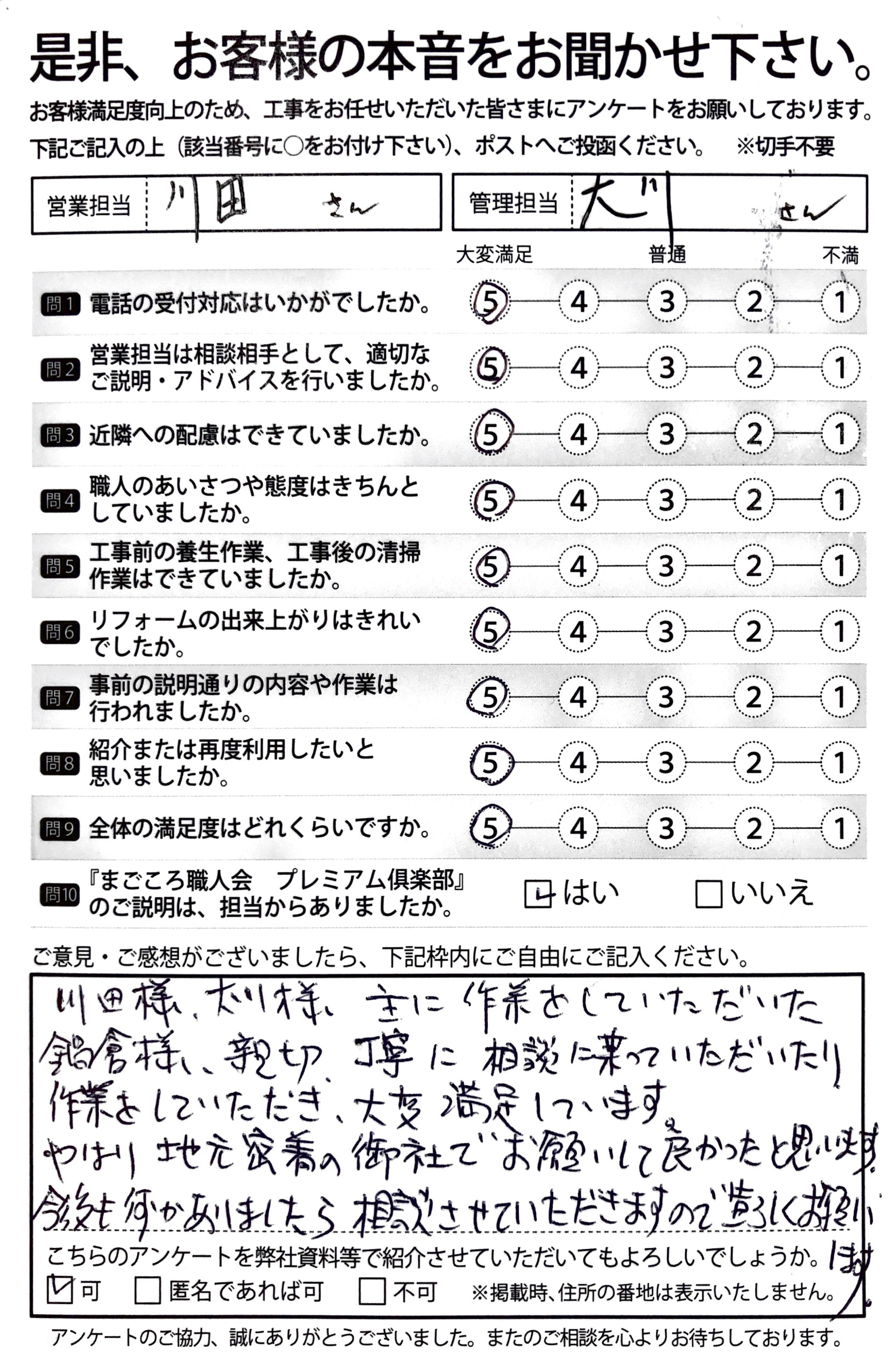 川田様、大川様、主に作業をしていただいた鍋倉様、親切丁寧に相談に乗っていただいたり作業をしていただき、大変満足しています。