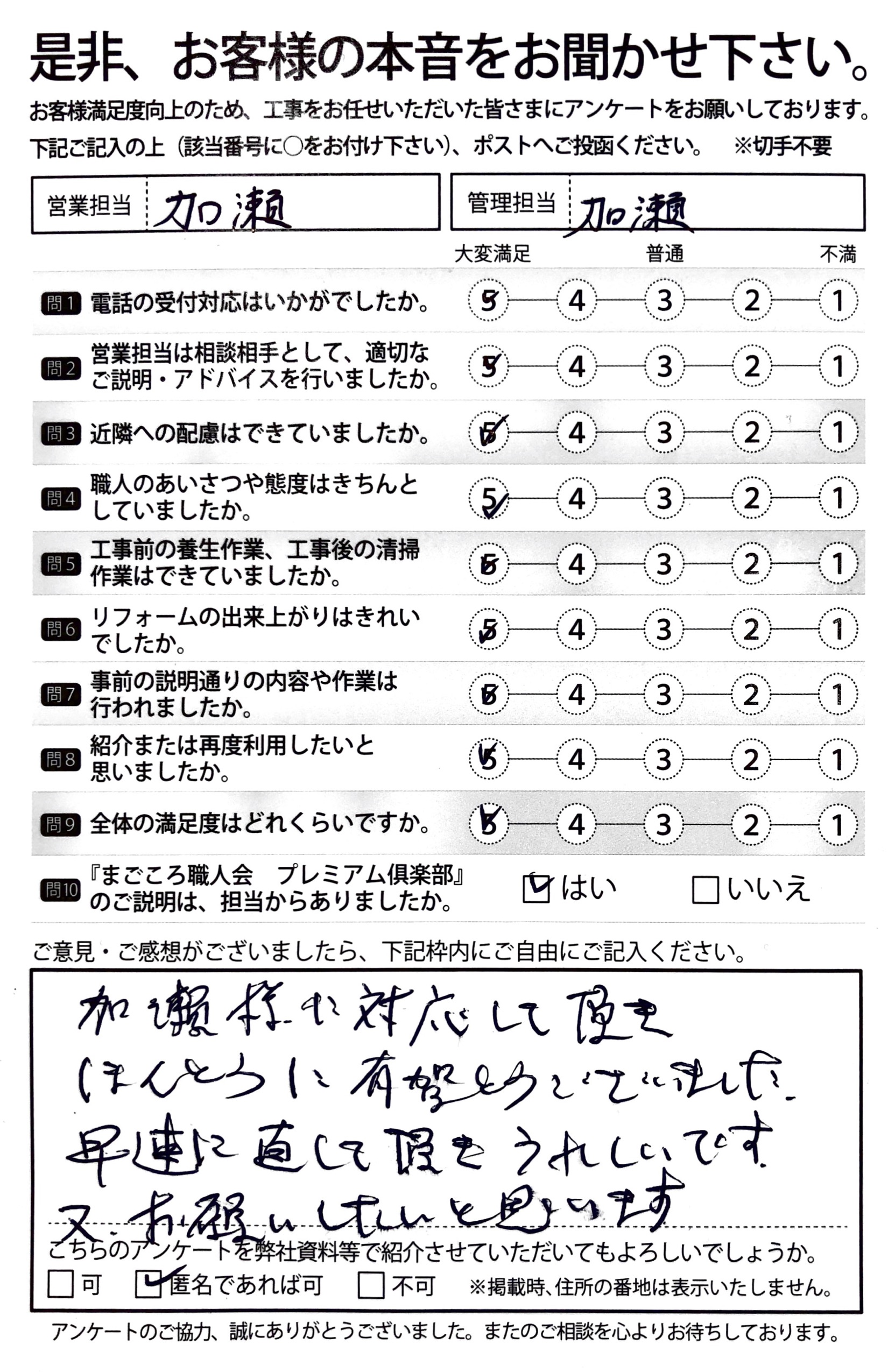 やはり地元密着の御社でお願いして良かったと思います。今後も何かありましたら相談させていただきますのでよろしくお願いします。