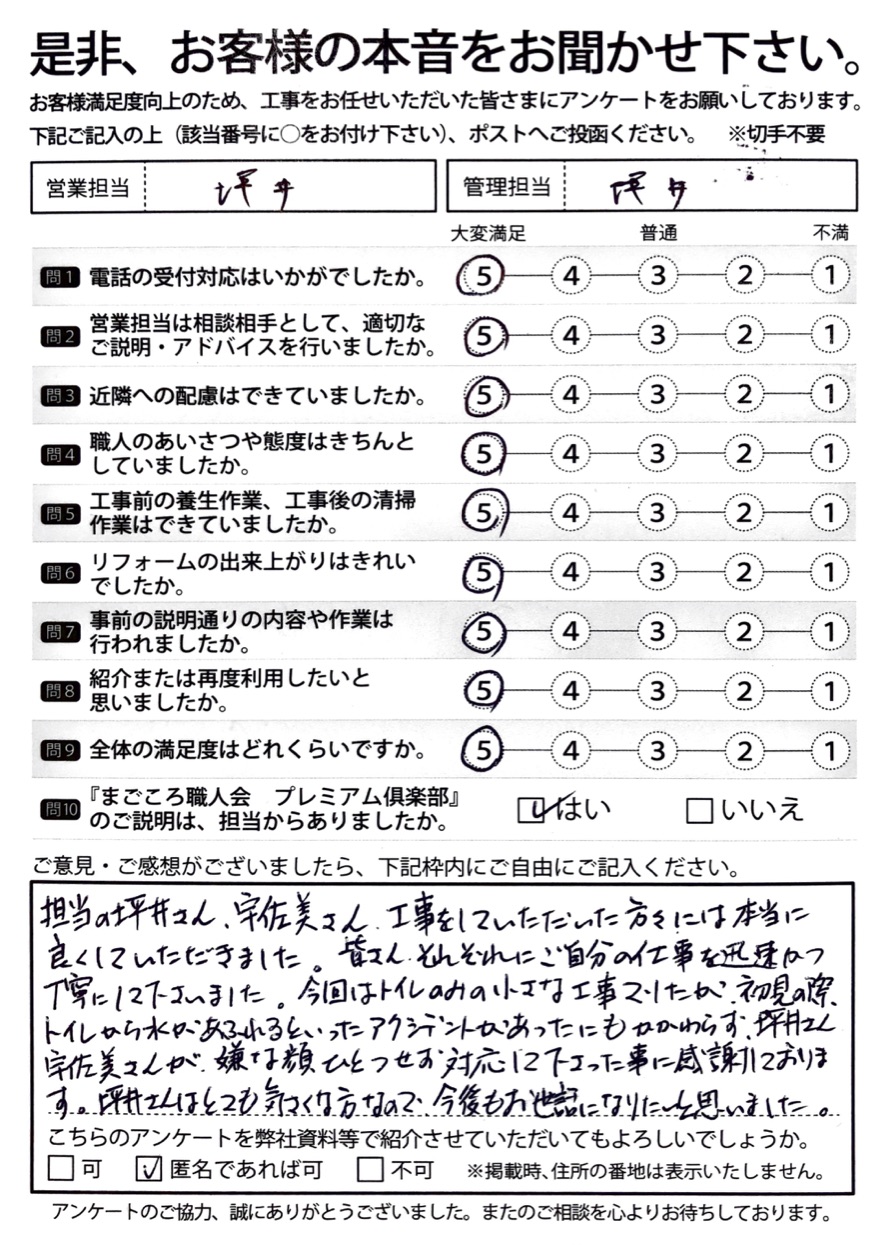 皆さん、それぞれにご自分の仕事を迅速かつ丁寧にして下さいました。今回はトイレのみの小さな工事でしたが初見の際、トイレから水があふれるといったアクシデントがあったにもかかわらず、坪井さん宇佐美さんが嫌な顔ひとつせず対応して下さった事に感謝しております。