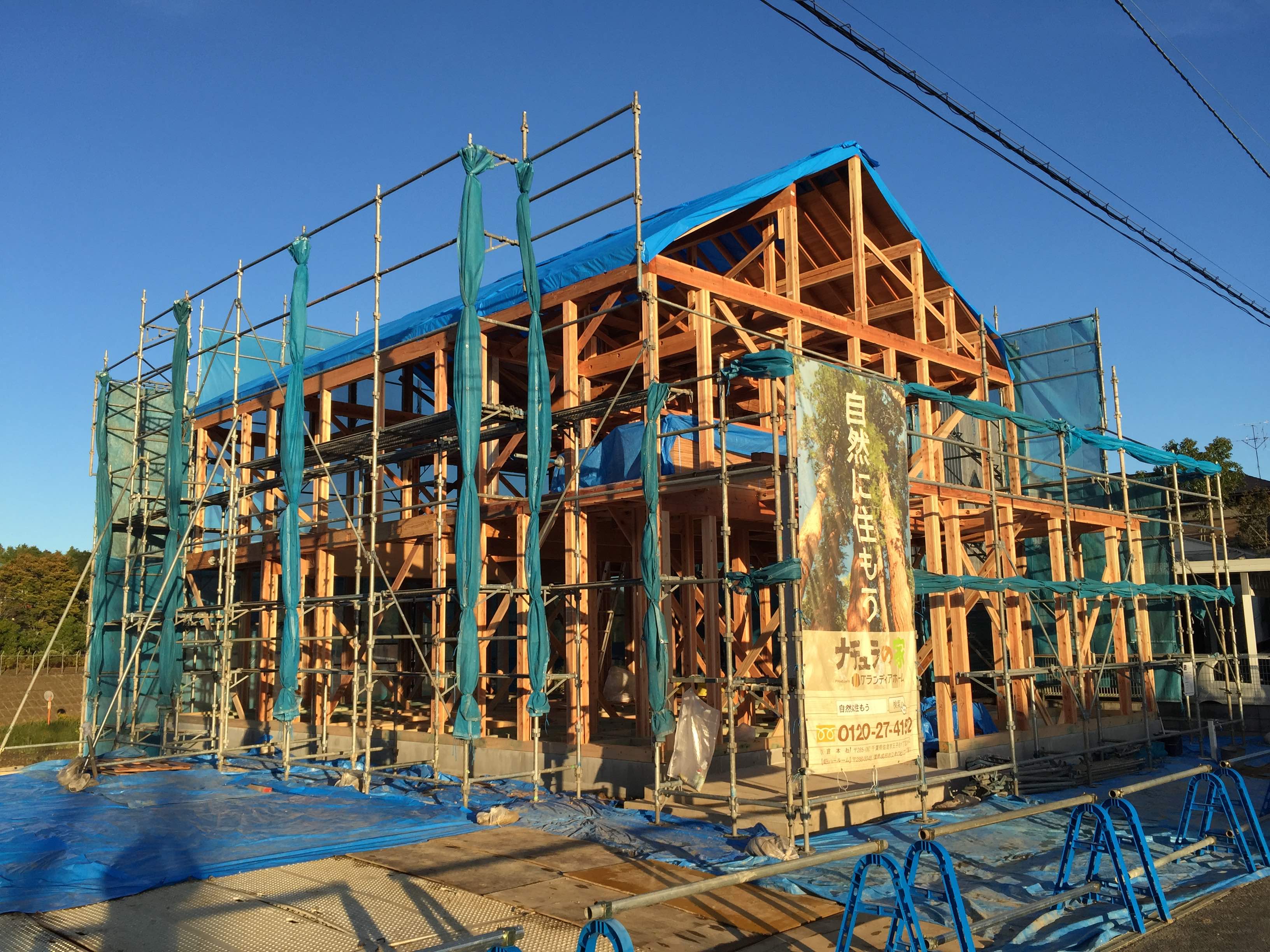 今回の『建築中の現場』は、上棟したばかりで柱や梁などの構造材(千葉県産材)をしっかりと見ることができます。
