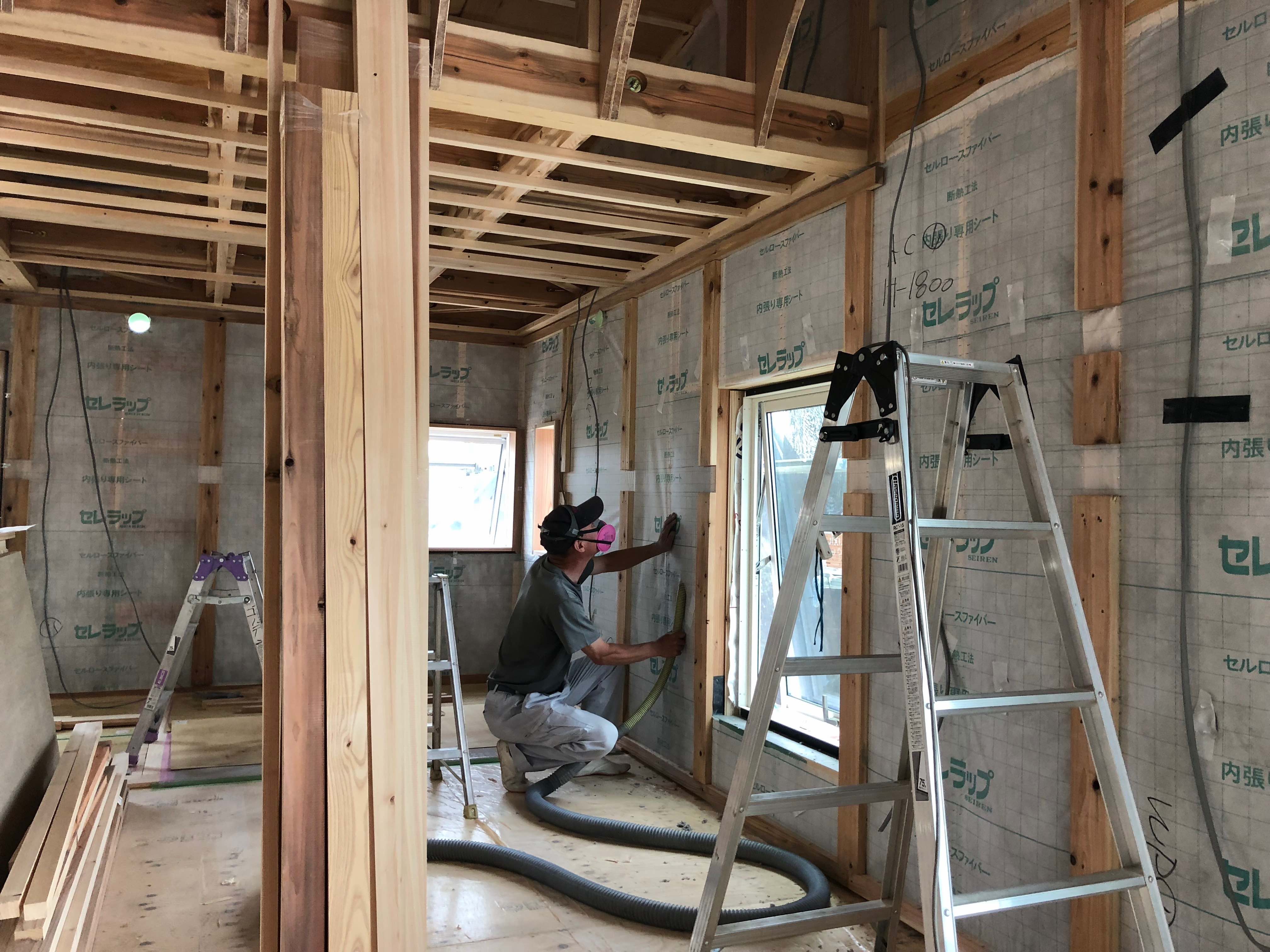 この日は、大工工事を中心に電気と断熱材のセルロースファイバーの吹き込みを行いました。