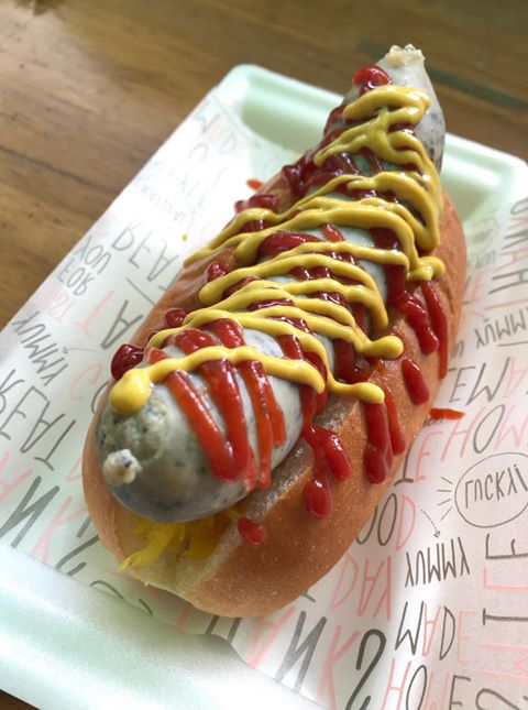 無料100食限定 「パンからはみ出す大きなハーブソーセージと特製カレーキャベツが入ったホットドッグ」