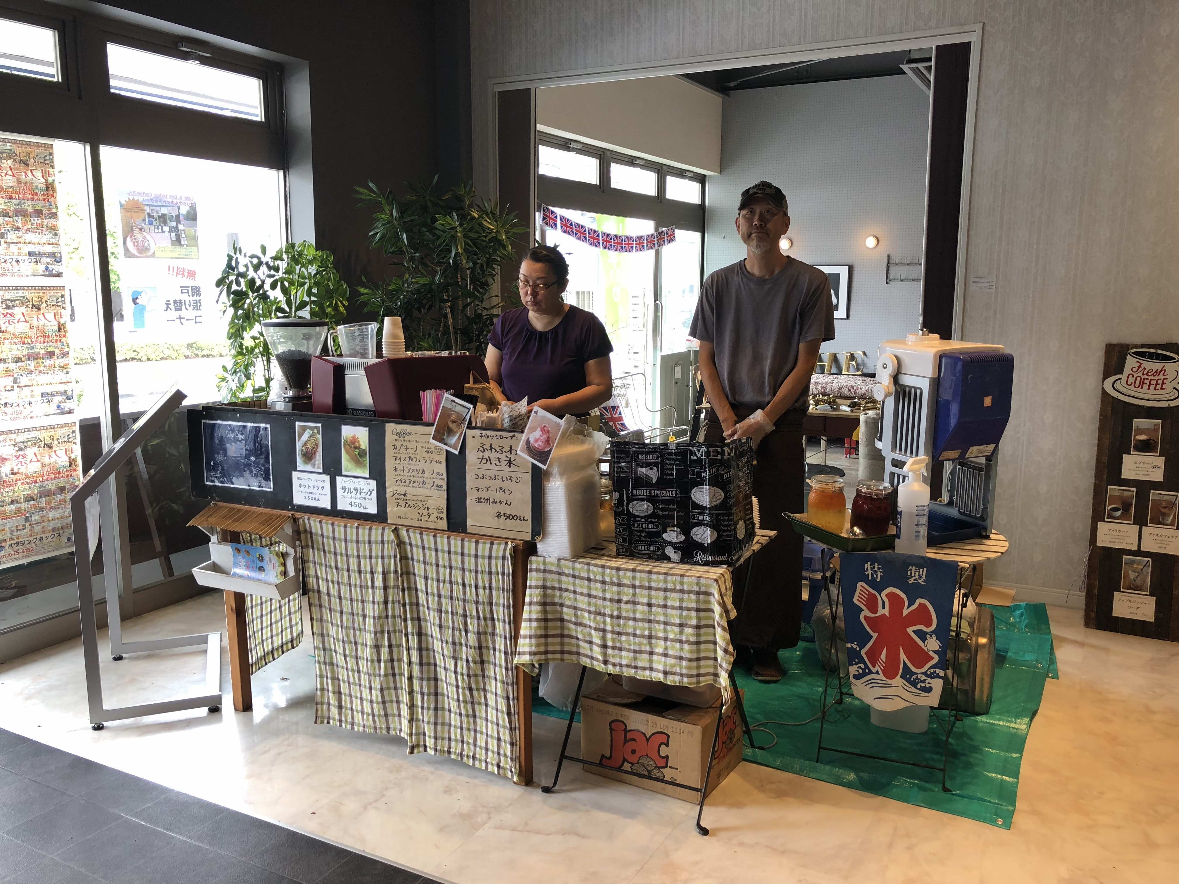 ホットドッグ(ケチャップ・サルサ)、自家製無添加シロップのふわふわかき氷、コーヒー、ドリンク