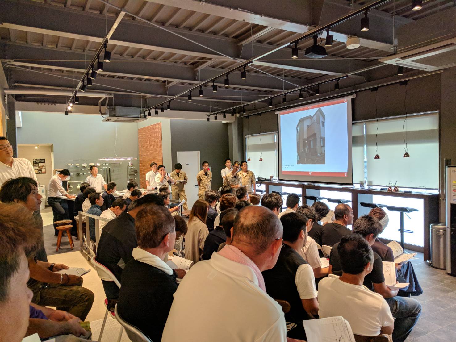 月に一度、自社・専属職人、メーカー、商社と社員が集まり、新築住宅とリフォームの各現場の工程と注意事項の共有・確認をはじめ、私も含め行っている現場巡回の報告などを行っています。