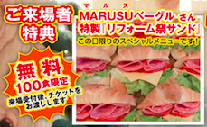 ▲佐倉市染井野のマルスベーグルさんの「リフォーム祭サンド」がご来場特典です!