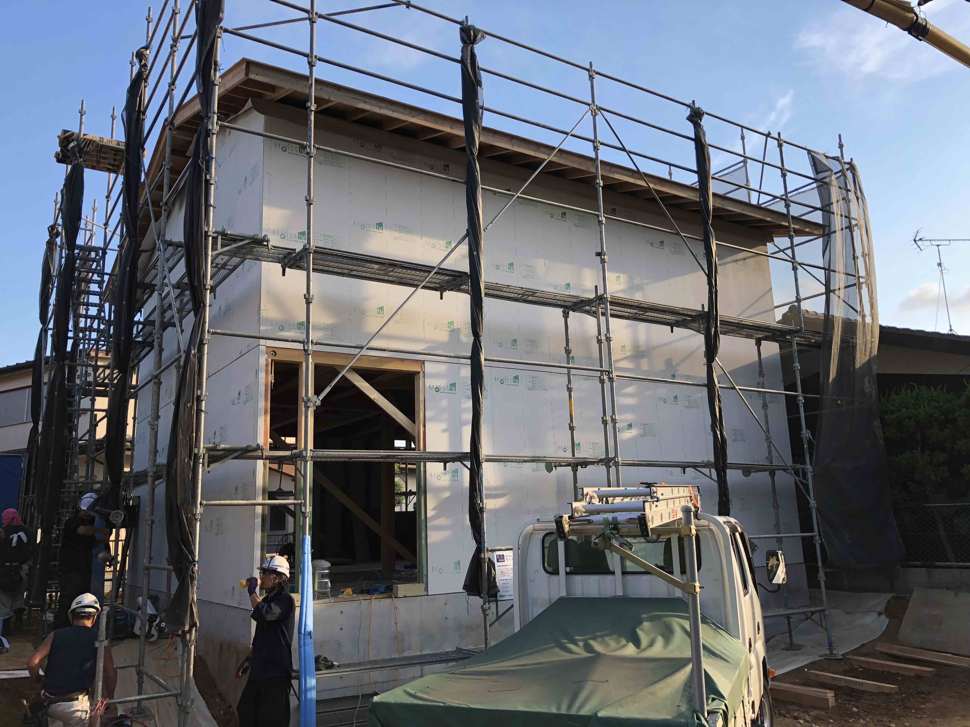 建物が白い壁で覆われていますが、これは耐力面材と言って、地震に対する抵抗力を高めるためのものです。