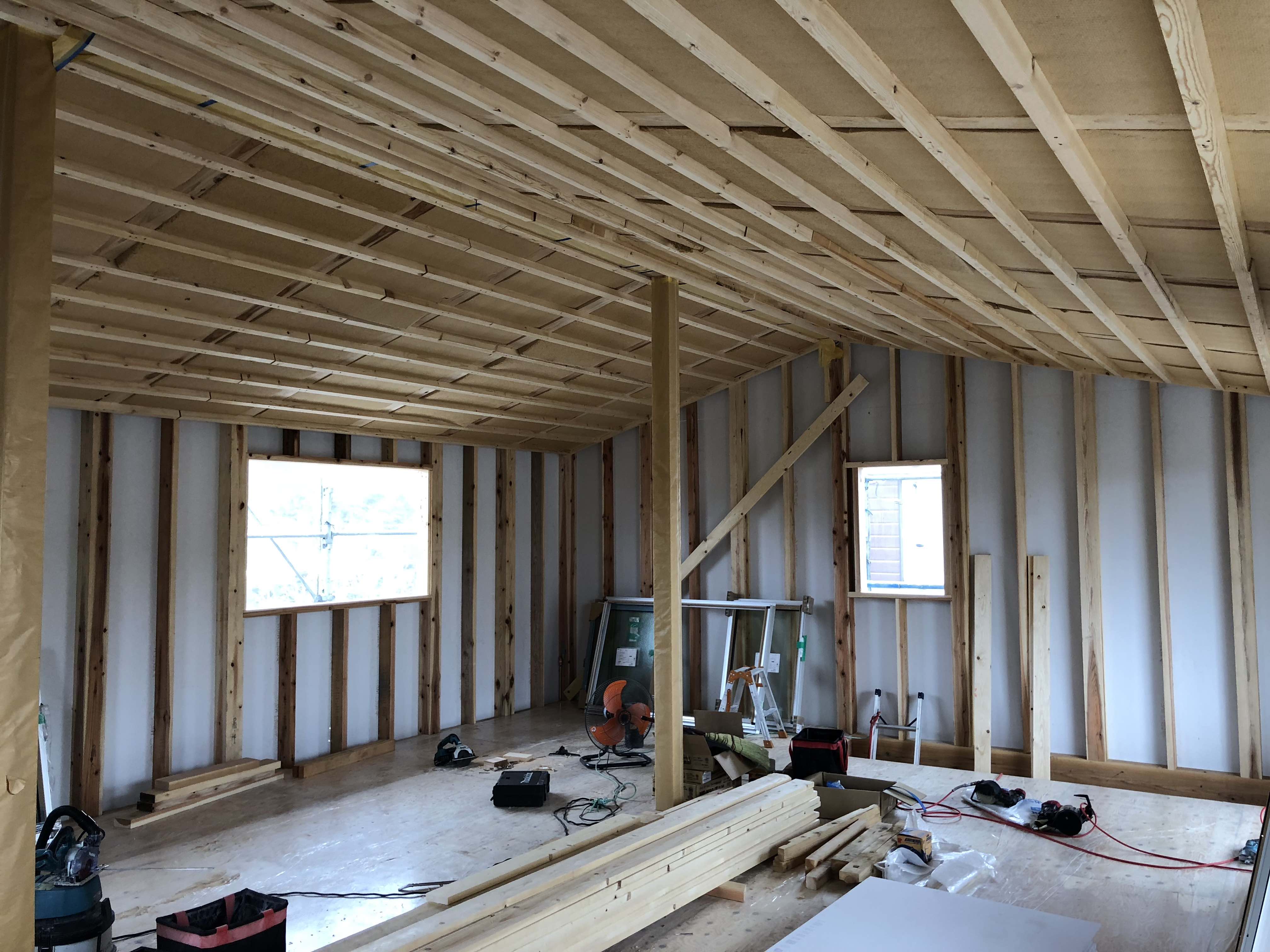 壁面に見える白い壁は、耐力面材のモイスです。この内側にセルロースファイバーという断熱材を自社職人が吹き込みます。