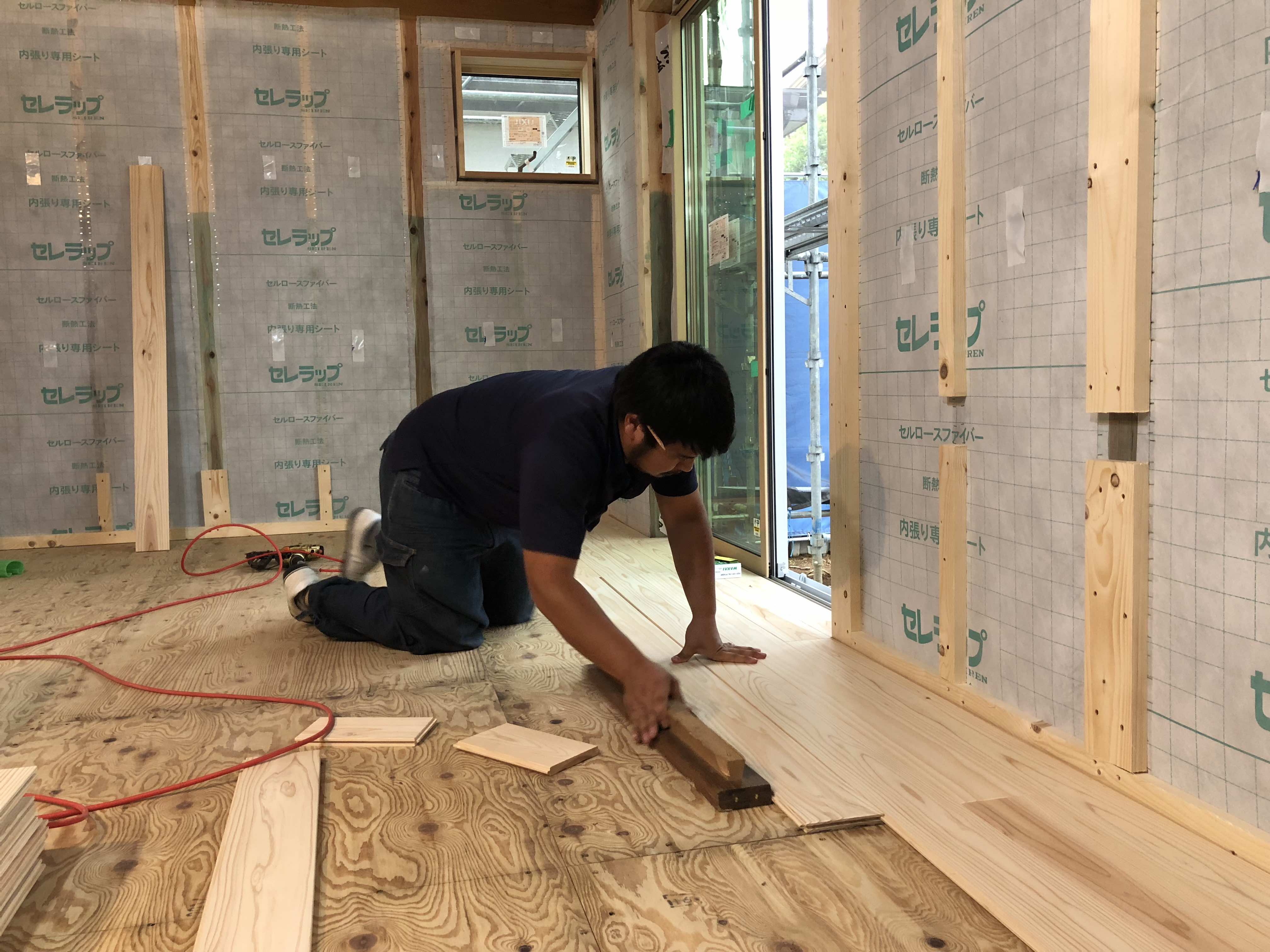 ▲無垢フローリングを張り始めています。