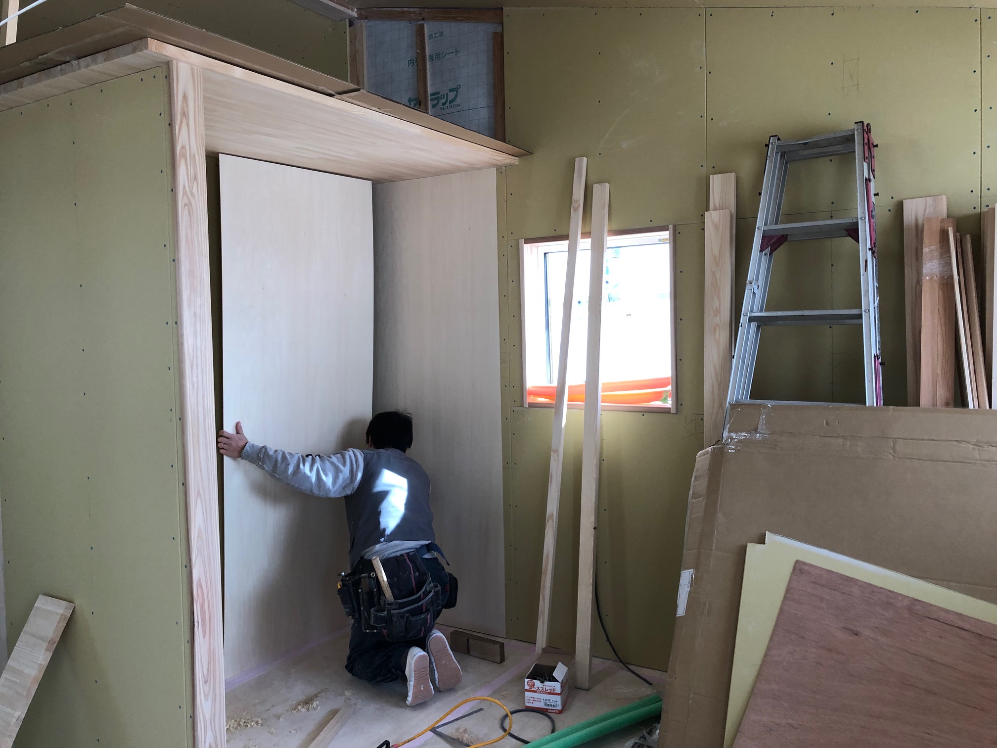 ▲大工が収納の造作を行っています。