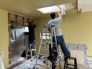 手前にいる大工は、ちょうどキッチンの真上にあるトップライト部分を作業中。