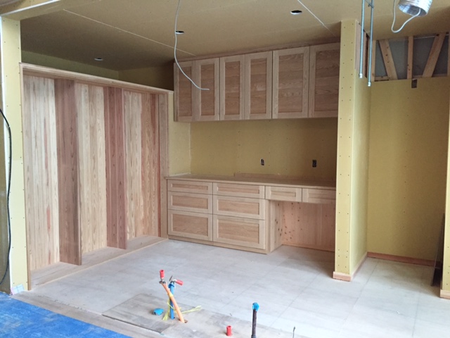 大工が造ったキッチン収納には、これから扉と棚がついて完成です。