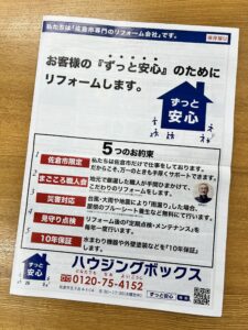 私たちがお客様にお伝えしたい、知っていただきたいのは『ずっと安心』という理念を持って、仕事をしていることです。佐倉市だけに集中していることです。万一のときも、すぐに駆けつけるということです。そのため、チラシには工事内容などが少なくなり、その代わりに『5つのお約束』や『ずっと安心パック』について、そして、私からのごあいさつなどに紙面を割いています。