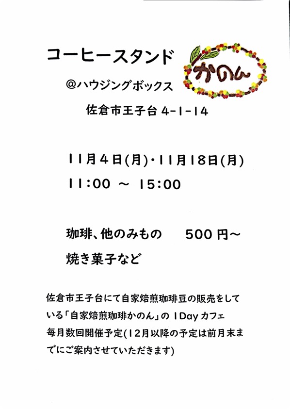 12月以降の「コーヒースタンド」の日程は、「自家焙煎珈琲かのん」さんのブログと当社ホームページのお知らせでご案内をさせていただきます。