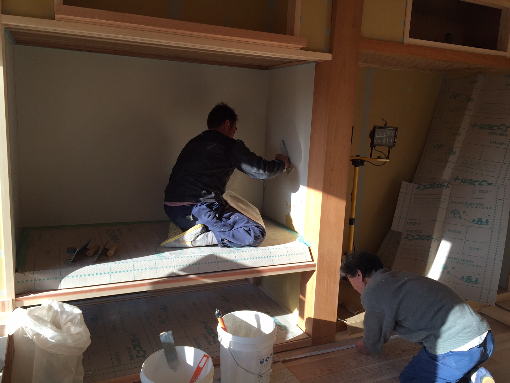 明日は、見学会開催時に左官職人が珪藻土を塗っている作業の様子を見ることができます。