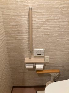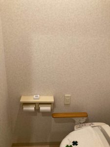 施工前は壁に掴まる場所はなく、据え置き用の福祉用具(肘掛け)が利用。限られたスペースに据えるのは動きづらく窮屈です。総合的に判断をして壁補強し手摺り新設が最適な選択となります。一方でトイレは1度に水を流す量(排水量)は13L(リットル)。最新トイレと比較し3倍以上の水量を使用。便器本体のくぼみに埃が溜まったり、便器本体のフチに凹凸があり汚れるなど、新しいモノと比較すると清掃面が劣ります。紙巻器・タオル掛け・クロス関連もこの機会に一新。