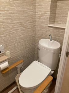 立上り補助用として『I型手摺り』を新設。壁補強をしてるので荷重を掛けても安心して利用でします。施工前と施工後を比較して施工後の新しいトイレは節水型タイプ。またフチなし形状で清掃面が数段アップ。ウォシュレット機能に便座からお尻をあげてから数十秒後に自動で水を流す『オート便器洗浄』機能もあります。振り向いてレバーをひねる動作は一切不要となります。そして今回の工事ではトイレ交換などに+αで内装工事(天井・壁クロス・床クッションフロア貼替)を実施。トイレが新しくなることでこれまに気にならなかった天井・壁クロスが古いままの状態では『気になる』のは間違いありません。経験上、『一緒に貼替えておけばよかった』との後悔をする方も数名見ております。今後、トイレ交換を検討している方は『内装(クロス張替え)工事』一緒に考えてみてください。