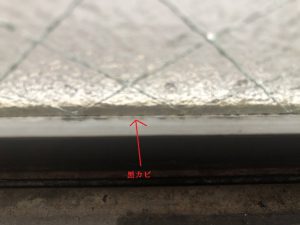 これはサッシのガラス押えで使われているゴムパッキンの黒カビです。