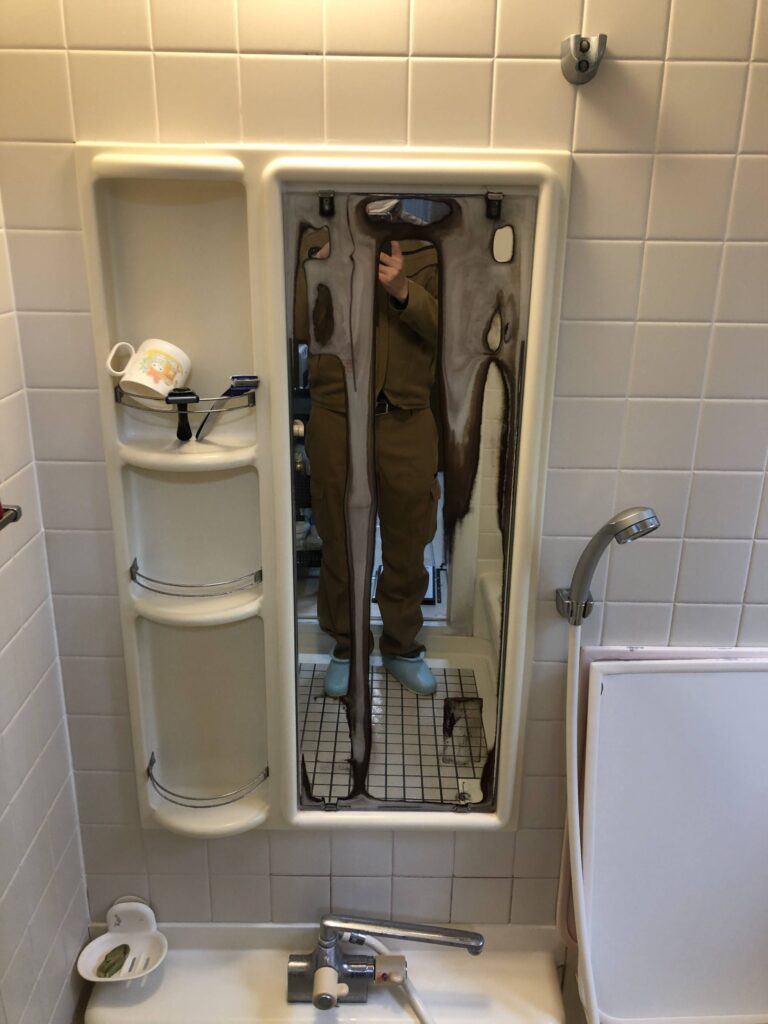 ある一定時期から浴室鏡の表面に黒い染み(カビ?サビ?)が出現。掃除を試みてみるものの一向に黒い染みが落ちない。それどころか黒い染みは徐々に日が経つにつれて広がっていき、見え難さと使い難さが日毎に増すばかり。また毎日使う場所(浴室)なので、長年この状態が続くのは嫌!!なるべく早く鏡だけを交換したい。既存浴室の色柄や浴槽形状等を大変気に入ってることから、浴室全体の工事は現時点では考えておらず。先ずは、今一番の悩みである【浴室の鏡本体】をどうにかしたい・・・綺麗にしたい。