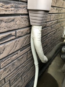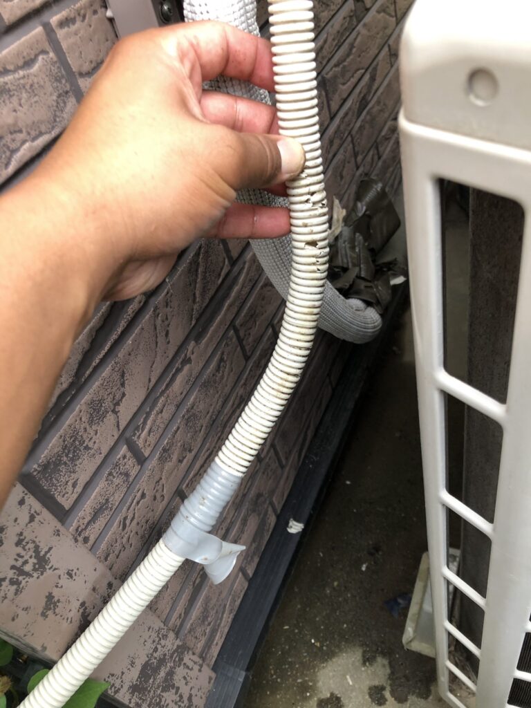 この時期湿度や気温が高くなってきたことで,みなさんもエアコンを使い始めた頃ではないでしょうか。使い始める時に,エアコン内部の洗浄をして準備することがメインとなり,室外機周辺の確認はあまりされていないかもしれません。外の部品で劣化が早く壊れやすい物の中に今回H様宅で修繕させていただいたドレーン菅があります。