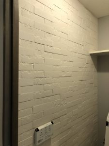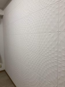 壁や床が完全にまっすぐとは限らないので、それぞれの状況に合わせて水平や目地の通りを調整していきます。
