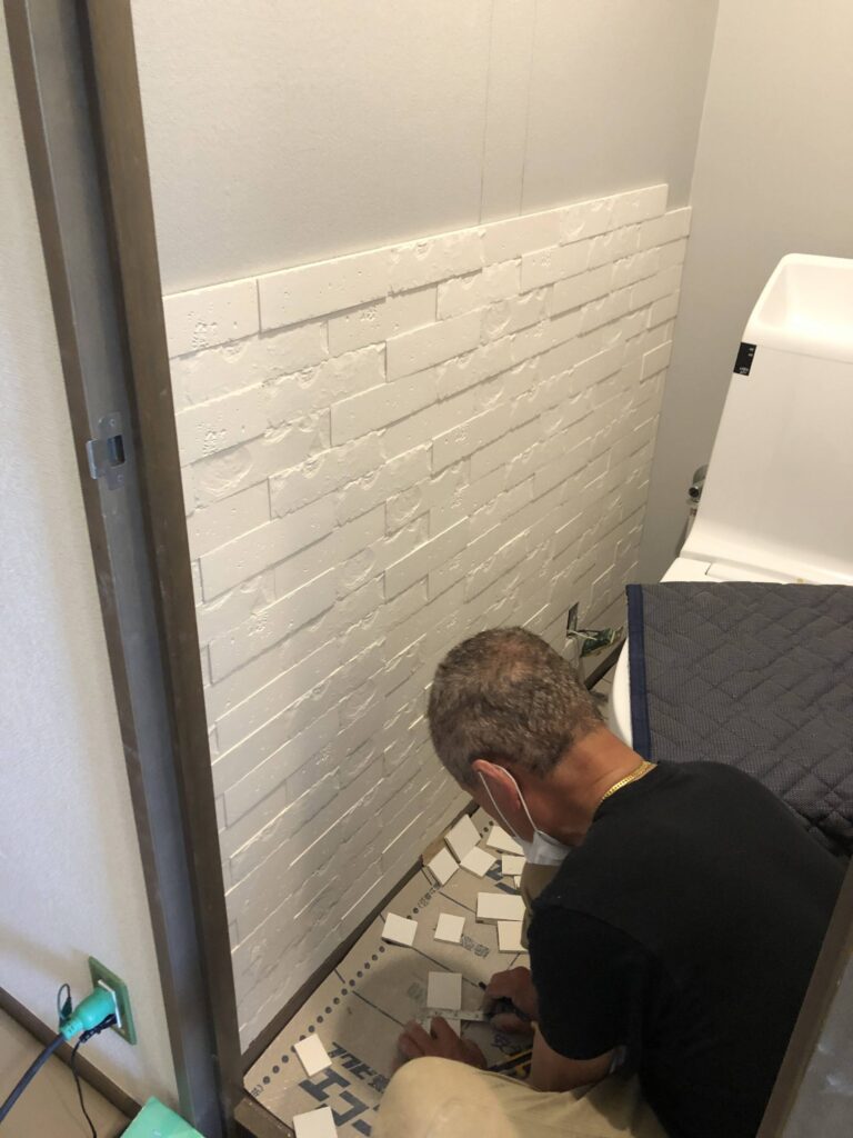 壁や床が完全にまっすぐとは限らないので、それぞれの状況に合わせて水平や目地の通りを調整していきます。