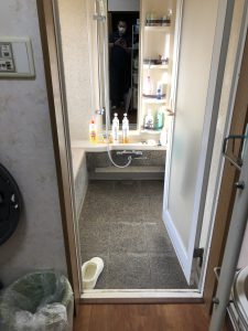 洗面所と浴室の境目(跨ぎ)には若干の段差があり、躓き転倒して怪我をする可能性があり危ないです。浴室の床や浴室鏡など水垢やカルキなど媚びりついてます。長年の付着の影響からかブラシなどで擦っても落とす事ができない頑固な汚れ。既存ユニットバスは20年近く以上前の商品で、現行品よりも断熱性が劣ります。