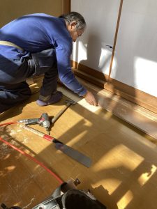 それからフローリングを上から貼っていきます。新しいフローリング自体の強度も高いのでダブルで補強になります。